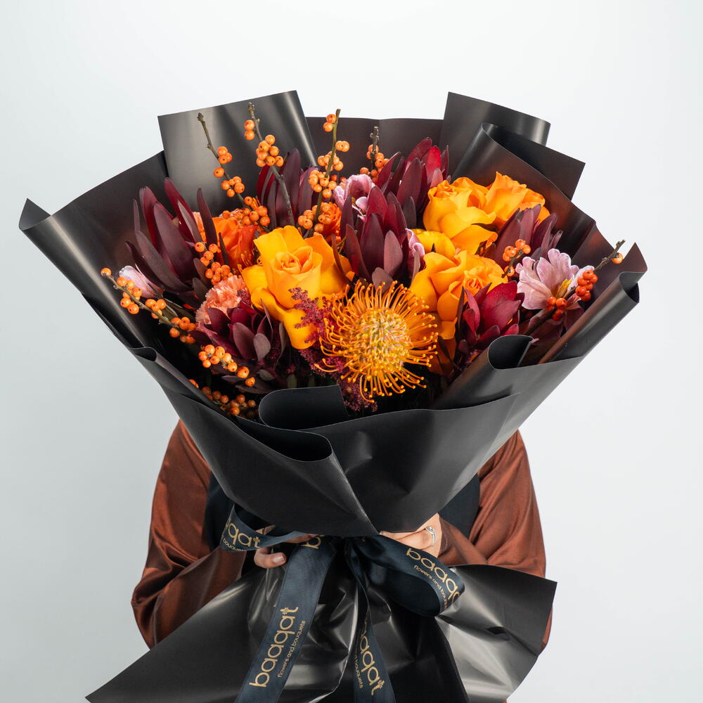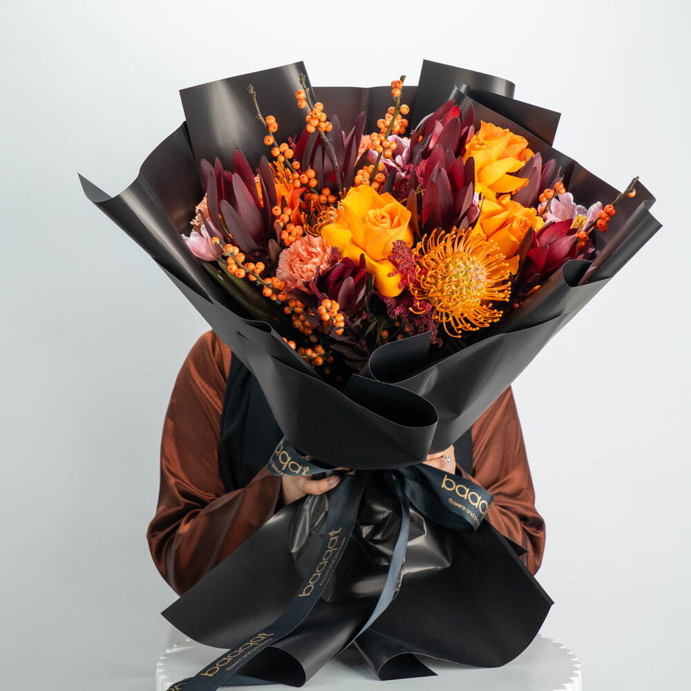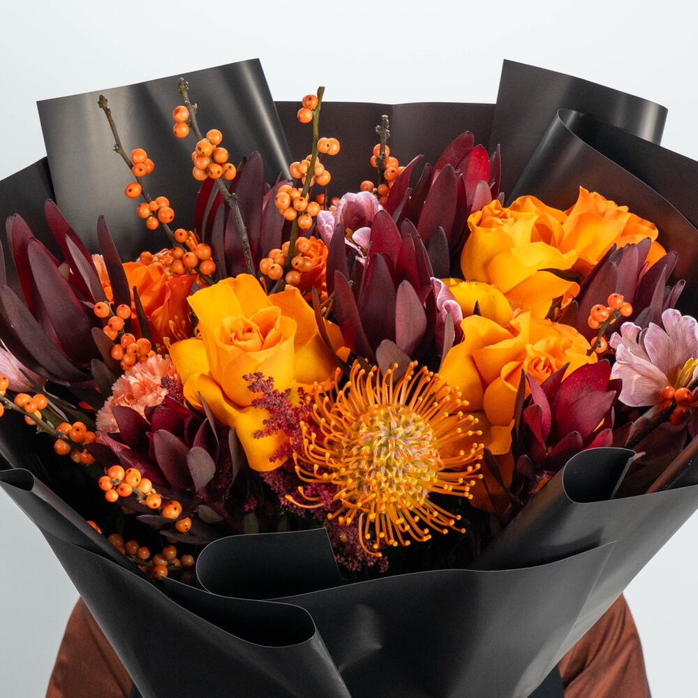 Déjate llevar por la calidez y la riqueza del cambio de estación con nuestro Ramo Atardecer de Terciopelo. Este espectacular arreglo artesanal captura la encantadora belleza de una profunda tarde de otoño, perfecto para crear un centro de mesa llamativo, regalar a un ser querido o celebrar una boda. Impresionante paleta de colores: Una lujosa mezcla de profundos y sensuales tonos borgoña y vibrantes tonos naranja quemado/óxido. Exótico punto focal: Presenta la magnífica textura y presencia de una protea naranja premium, un verdadero símbolo de valentía y fuerza. Ricas flores afelpadas: Generosos racimos de aterciopeladas rosas borgoña y óxido, y dalias/claveles que añaden profundidad y volumen. Textura boho: Artísticamente arreglado con eucalipto aromático y polvoriento y delicados elementos secos para un acabado moderno, de espíritu libre y con textura. Perfecto para: Cumpleaños, aniversarios, condolencias, inauguración de la casa, eventos de otoño/invierno o simplemente un impresionante regalo "porque sí". Atadas a mano y envueltas con esmero, listas para colocar en su florero favorito. Instrucciones para el cuidado de las flores Cuidado inmediato: En cuanto reciba su ramo, desenvuelva los tallos y colóquelos inmediatamente en un florero limpio con agua fresca. Preparación de los tallos: Recorte: Use tijeras afiladas para cortar de 2,5 a 5 cm de la base de cada tallo en un ángulo de 45 grados. Esto permite una máxima absorción de agua. Limpieza: Retire cualquier follaje que quede por debajo de la línea de agua en el florero. Las hojas que se quedan en el agua se pudrirán y contaminarán el agua, acortando la vida de las flores. Ubicación del agua: Agua: Cambie el agua a diario o al menos cada dos días. Si recibió fertilizante para flores, use un paquete nuevo con cada cambio de agua. Ubicación: Exhiba sus flores en una habitación fresca, alejada de la luz solar directa, rejillas de calefacción o ventanas con corrientes de aire. Nota especial para la protea: La protea y otros tallos leñosos exóticos son muy resistentes. Asegúrese de que tengan un corte profundo y limpio antes de colocarlas en agua. Se mantienen bien por naturaleza, pero agradecen el agua fría y rociar la cabeza de la flor a diario (opcional).
