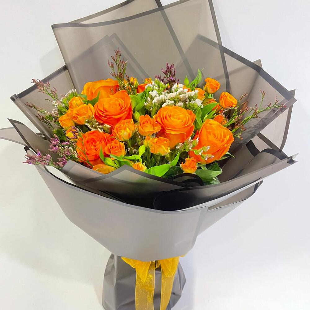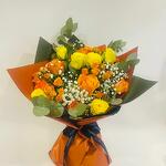 Spray rose - 3 ud. Yellow rose - 7 ud. orange rose - 7 ud. gypsophila flower - 20 gr hojas de eucalipto - 5 ud.