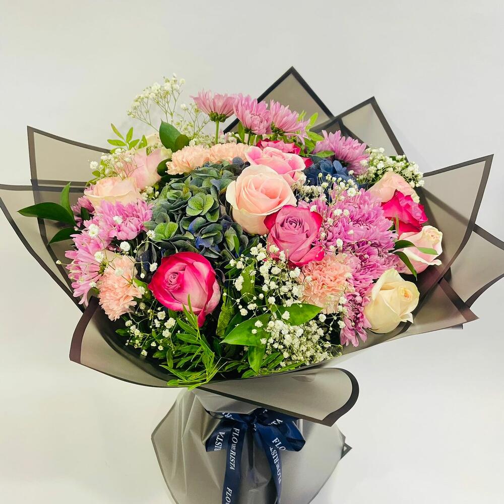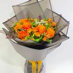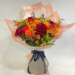 Ramo floral mixto que incluye rosas frescas premium y está combinado con eucalipto y rellenos alegres. Preparado con papel de envoltura decorativo.