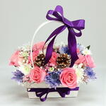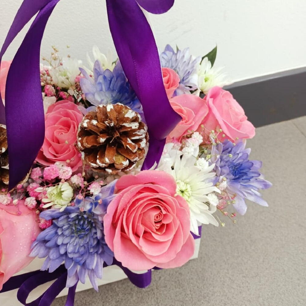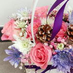 Un arreglo de cesta de ensueño y delicado con suaves rosas rosadas y singulares crisantemos azul bígaro. Adornado con piñas nevadas y delicadas flores de relleno rosas, está rematado con un llamativo lazo de satén morado real sobre un asa blanca, creando una mágica estética color ciruela dulce ideal para toda la temporada.