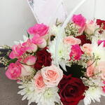 Esta elegante composición se presenta en un impecable bolso tote acolchado blanco con elegantes asas arqueadas. Incluye una colección variada y con textura de flores, entre ellas rosas rojo profundo aterciopeladas, rosas fucsia vibrantes y suaves rosas spray en tono melocotón. Estas están arropadas entre crisantemos crema y ligeras flores de relleno blancas, creando una estética exuberante, similar a un prado. Una tarjeta de regalo personalizada se coloca en un lateral, lo que la convierte en una opción ideal para un gesto atento de cumpleaños o de agradecimiento.