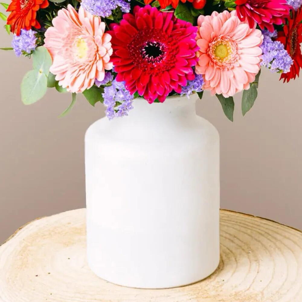 💐 Incluye: • 30 gerberas • 5 unidades de statice • 5 eucaliptos • Diseño elegante y presentado en un hermoso jarrón • Tarjeta personalizada gratis (EN INGLÉS) ❤️ Ideal para: Sorpresa | Aniversario | Regalo | Porque sí | Momentos especiales | Amor | Cualquier ocasión ⚠️ NOTAS IMPORTANTES: • Algunas flores pueden ser sustituidas por otras según disponibilidad • Si el jarrón está agotado, se sustituirá por otro similar - Algunas de nuestras flores pueden llegar en capullo, listas para florecer ⚠️ NOTAS IMPORTANTES: • Algunas flores pueden ser sustituidas por otras según disponibilidad • Si el jarrón está agotado, se sustituirá por otro similar - Algunas de nuestras flores pueden llegar en capullo, listas para florecer