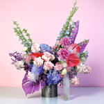 Anthurium - 3 ud. rose pink - 6 ud. purple rose - 2 ud. hydrangea blue - 3 ud. delphinium azul - 3 ud. caja redonda negra - 1 ud. hoja de strelizia - 3 ud.