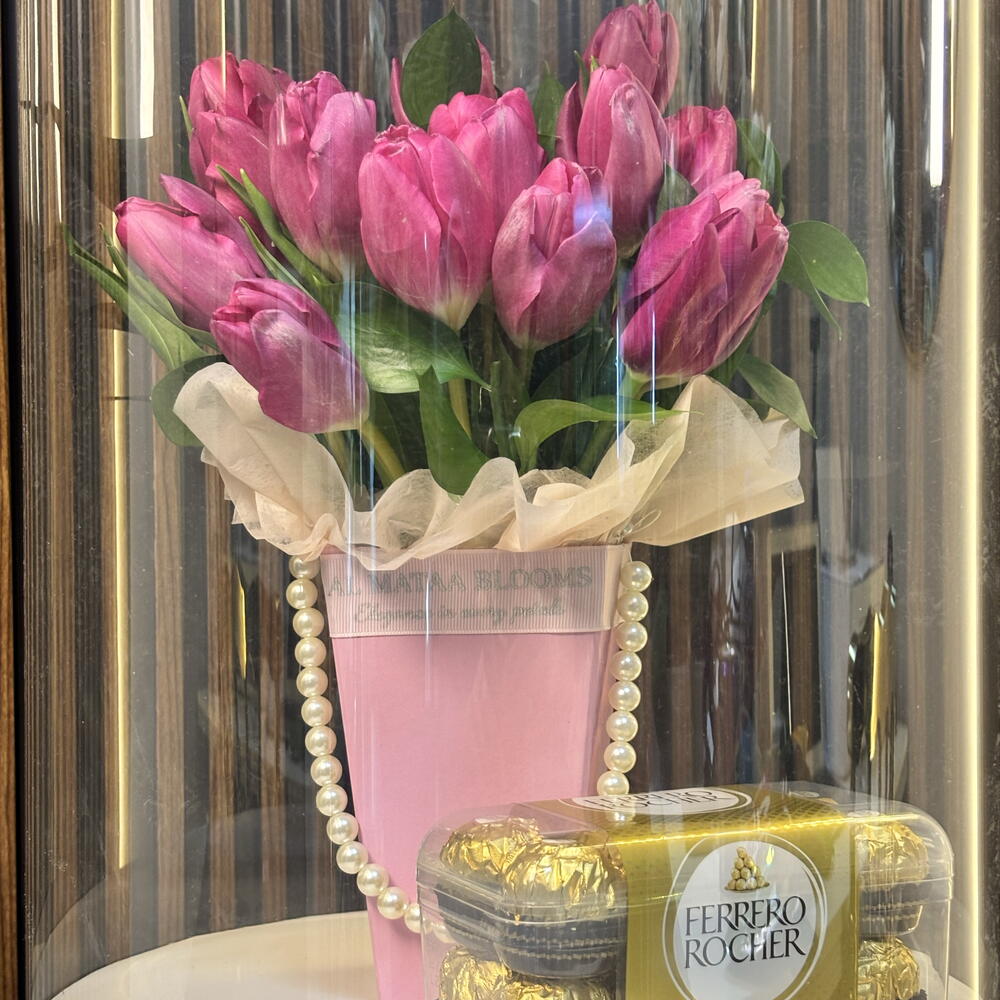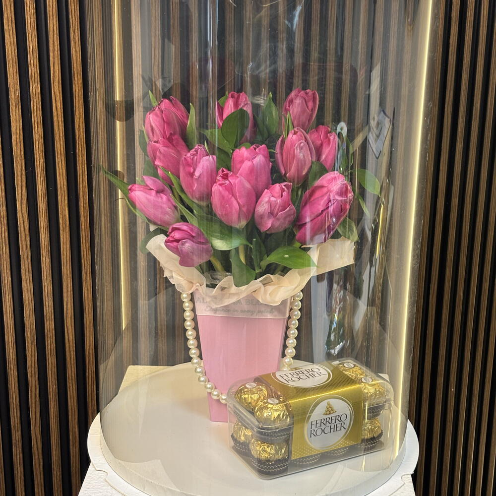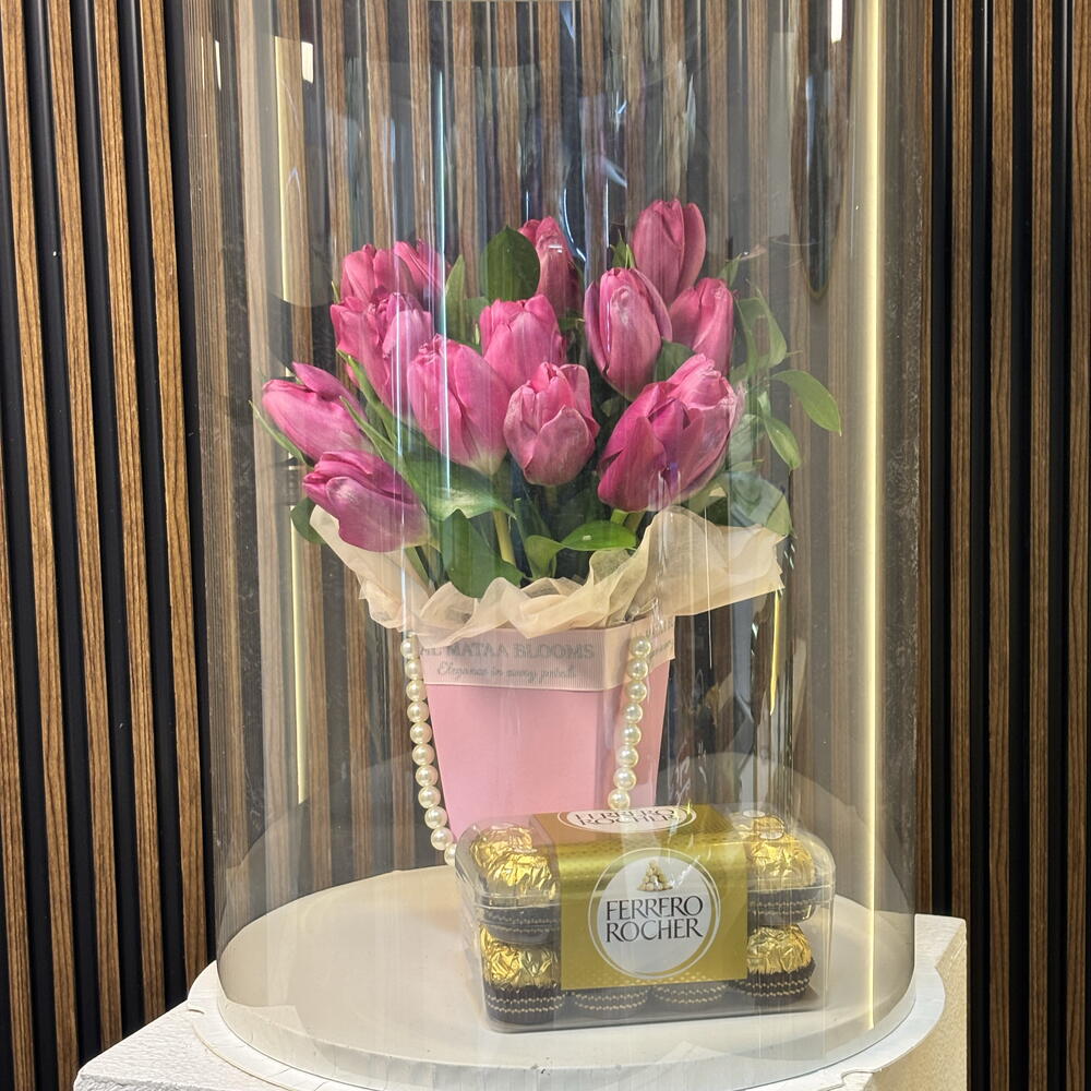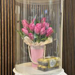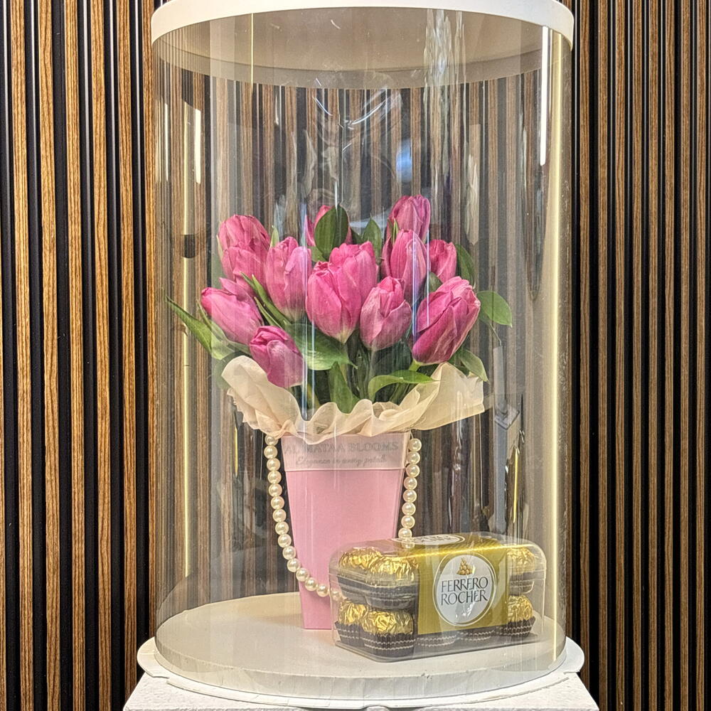 Una deslumbrante fusión de elegancia e indulgencia. Esta cuidada presentación incluye un exuberante ramo de tulipanes de un vibrante color rosa, ubicado en un elegante jarrón rosa con detalles en perlas. Encerrado en un cilindro arquitectónico de cristal transparente, el arreglo va acompañado de una clásica caja de bombones Ferrero Rocher. Es más que un regalo; es una pieza central diseñada para quienes aprecian las cosas más refinadas.