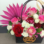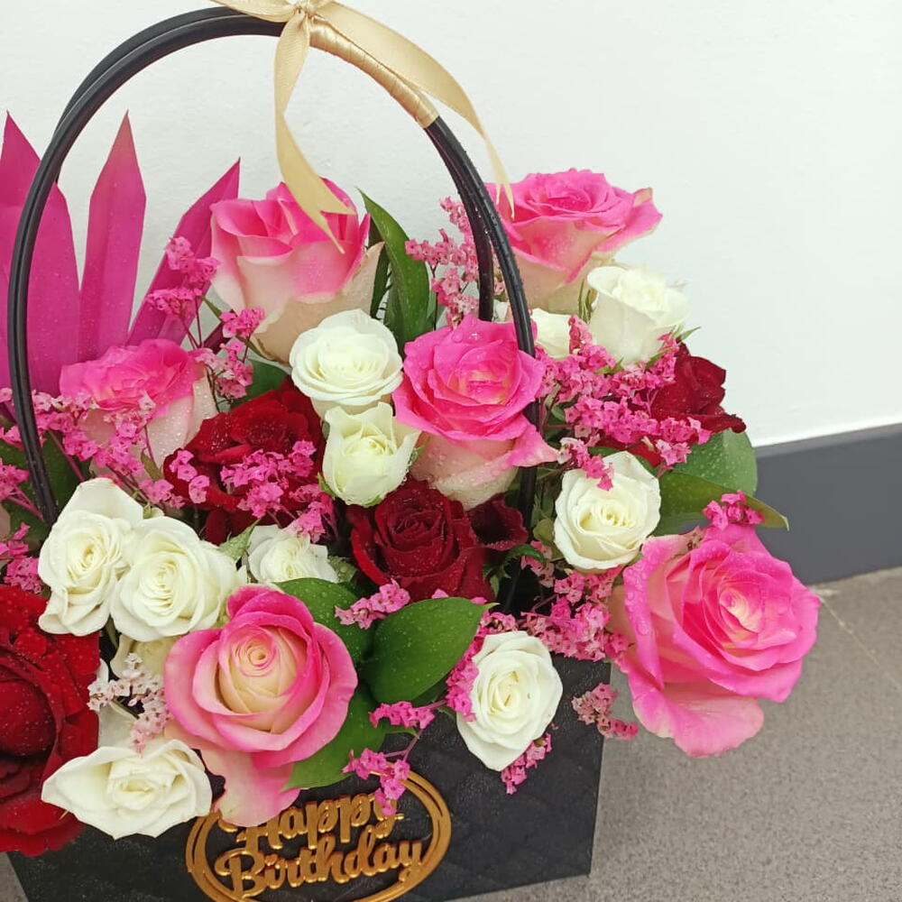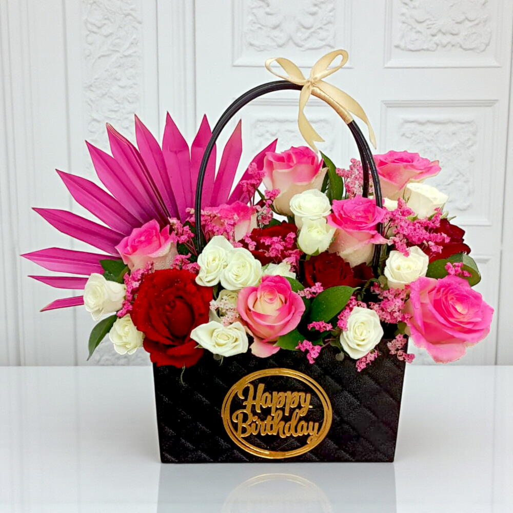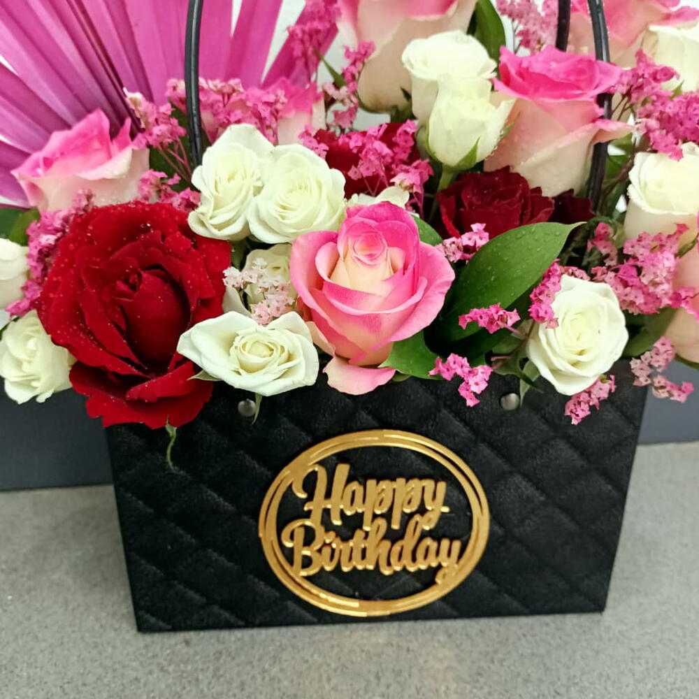 Este sofisticado regalo floral presenta una vibrante combinación de rosas premium en tonos carmesí, crema y rosa caramelo bicolor, dentro de una elegante bolsa negra acolchada. Decorado artísticamente con una llamativa rama de palma teñida en fucsia y delicados rellenos rosas, el arreglo está coronado con un emblema dorado de "Feliz Cumpleaños", lo que lo convierte en una pieza elegante y de alta costura para una celebración especial.