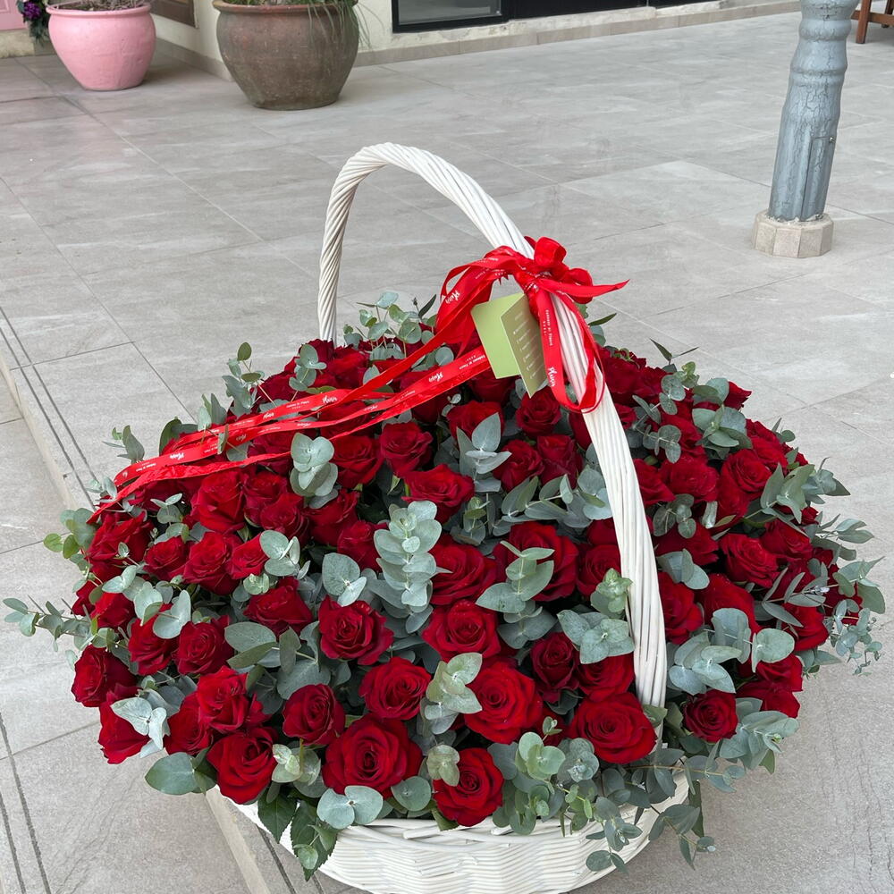 El más grande de todos los cestos, de más de un metro de tamaño y profundidad y con más de 300 tallos de eucalipto y rosas mezclados, hacen de esta la cesta de rosas vvip más increíble, ¡una obra de arte! Un gesto grandioso para distinguirte del resto