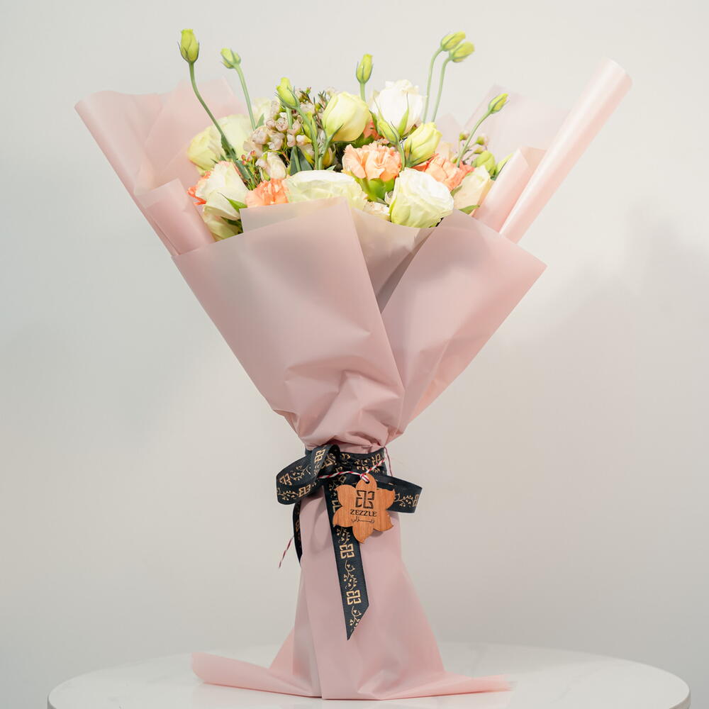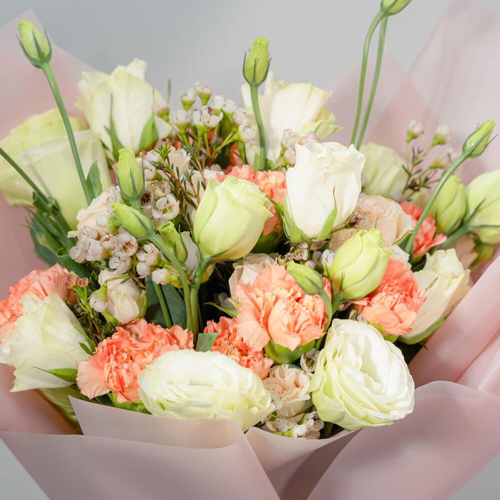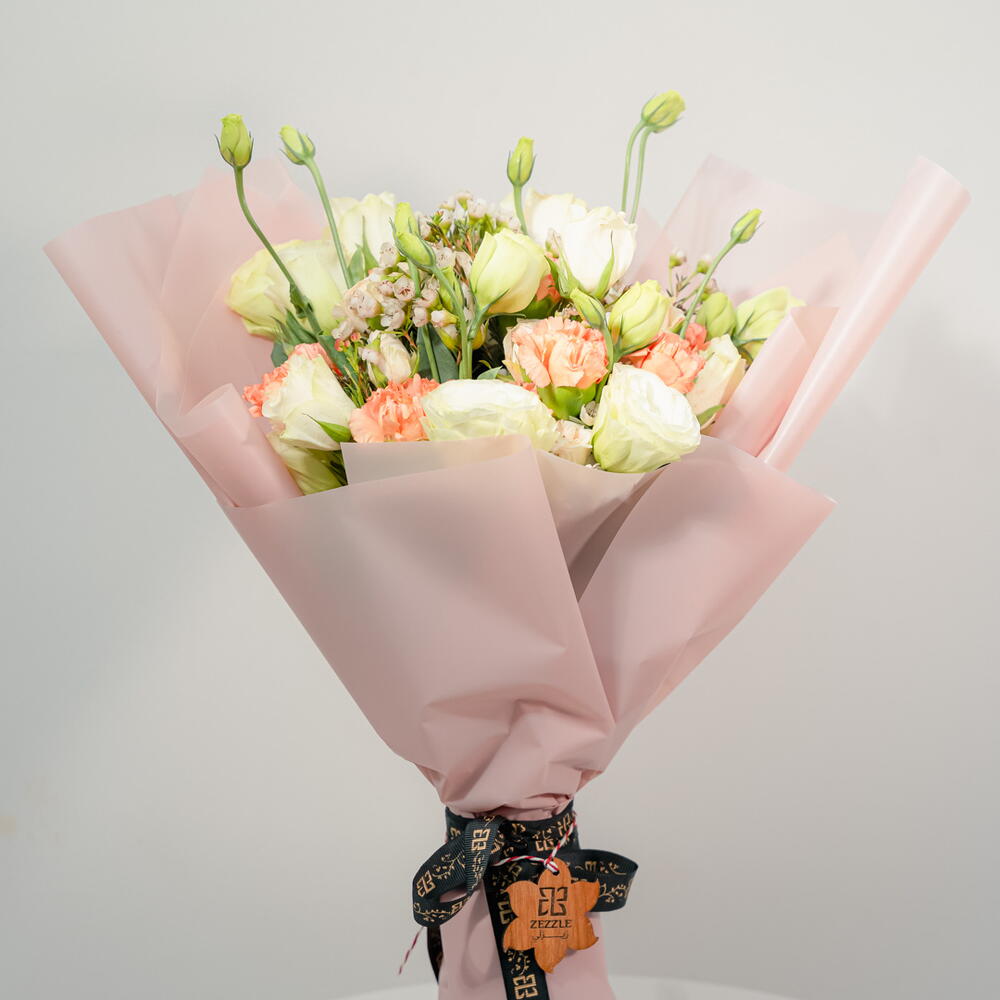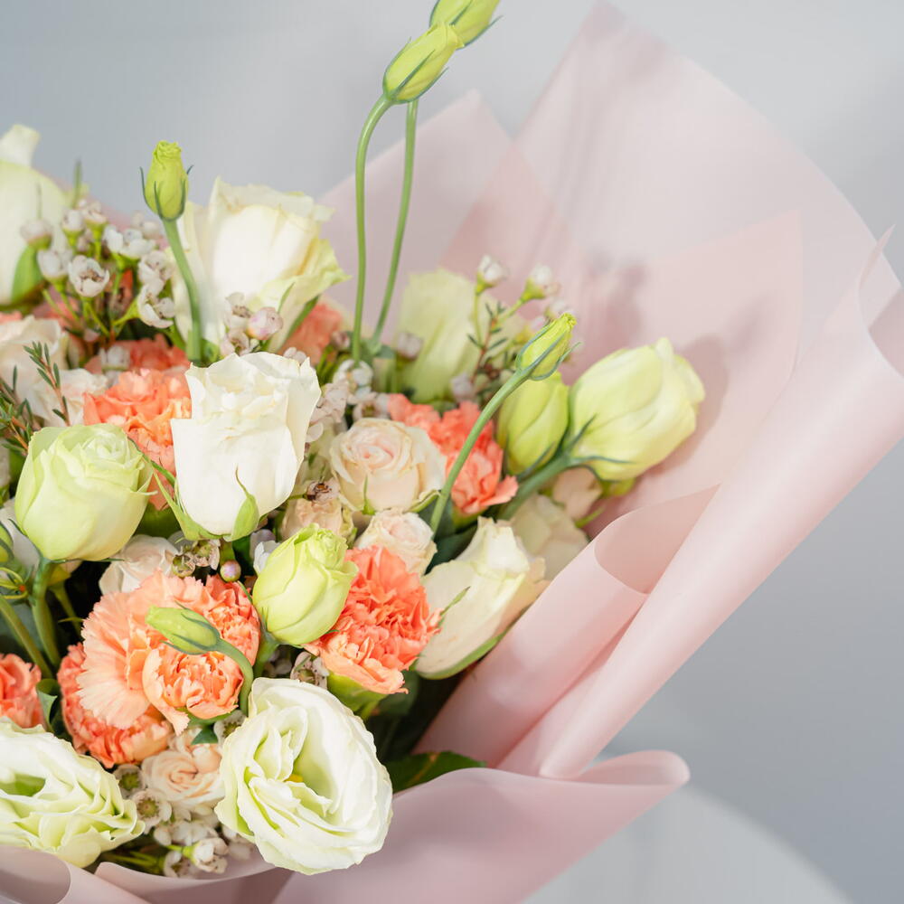 Un ramo alegre y vibrante, "Un Toque de Sol" incluye 5 delicadas Eustomas moradas, 7 Eustomas blancas, 10 alegres claveles naranjas y 5 etéreas flores de cera blancas. Esta armoniosa combinación de colores crea un arreglo cautivador y estimulante. Perfecto para expresar alegría, amistad o simplemente para alegrarle el día a alguien.