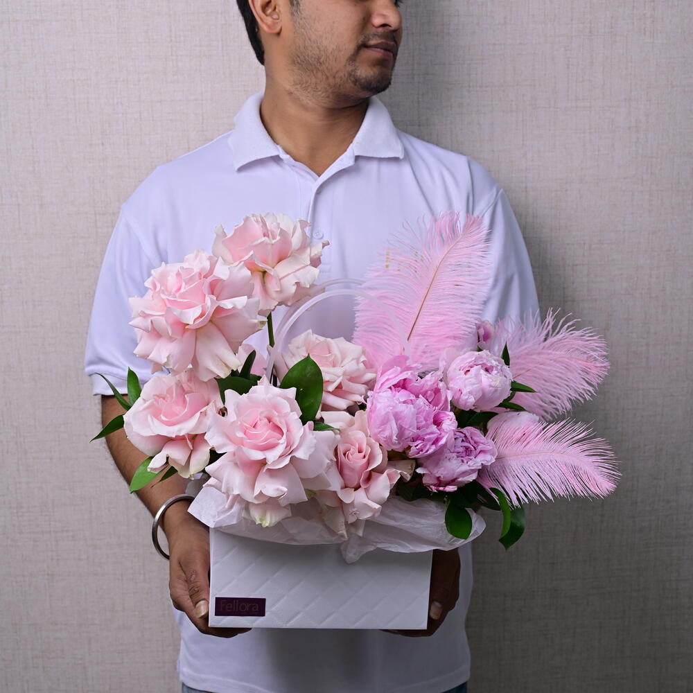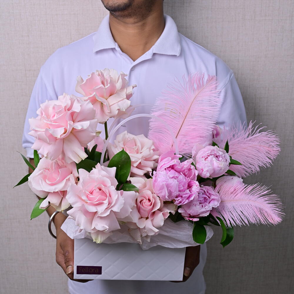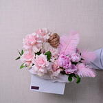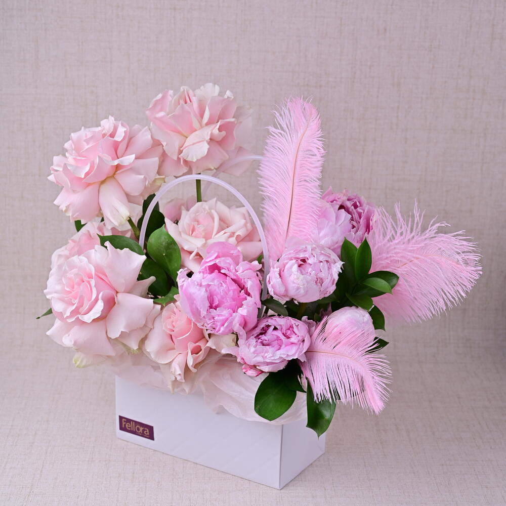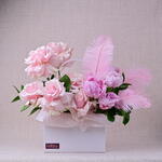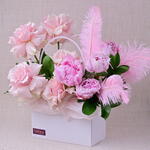 Ruscus - 5 ud. peonía rosa - 5 ud. mundial rosa - 7 ud. pluma - 3 ud. bolsa blanca - 1 ud.