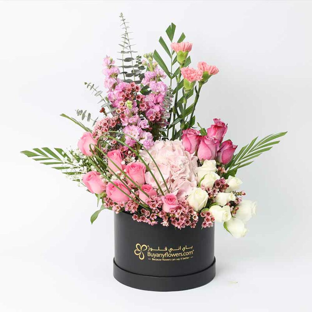 Detalles del producto: 1 hortensia rosa, 7 rosas rosa, 7 rosas blancas, 4 rosas moradas, 3 matthiola rosa, 4 claveles rosa, 2 tallos de cera rosa, hojas y rellenos - 3 palma areca, 2 eucalipto flexi grass y gipso, preparado en una caja redonda negra.