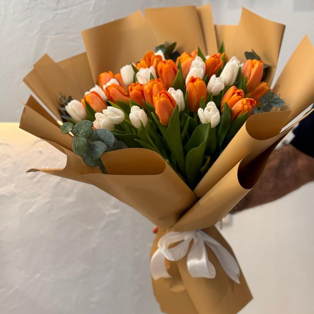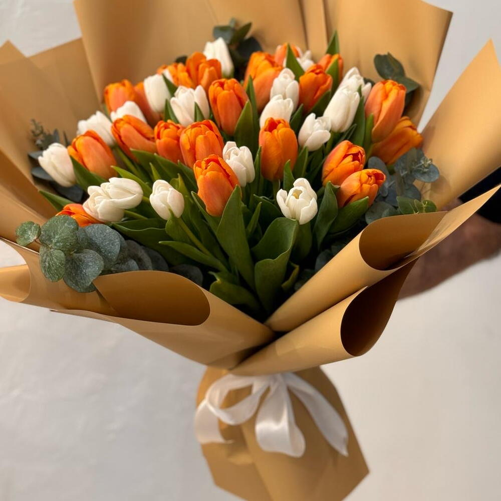 Eleva cualquier ocasión con este lujoso Ramo Mono. Sumérgete en una vibrante mezcla de 20 tulipanes naranja bañados de sol entrelazados con 20 tulipanes blancos de elegancia sin esfuerzo. El ramo se remata delicadamente con 5 hojas cuidadosamente seleccionadas y otros elementos, añadiendo un verdor duradero a este impresionante espectáculo visual. Este impresionante arreglo es la manera perfecta de mostrarle a alguien especial que está en tus pensamientos.