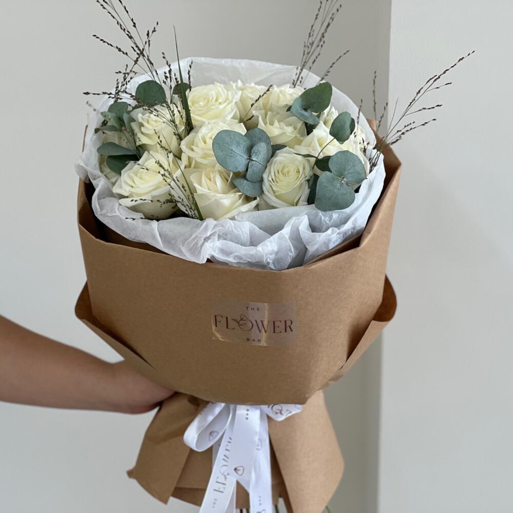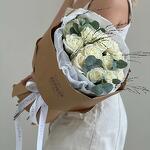 Hermoso ramo redondo de 20 rosas blancas en papel kraft.