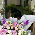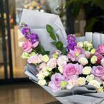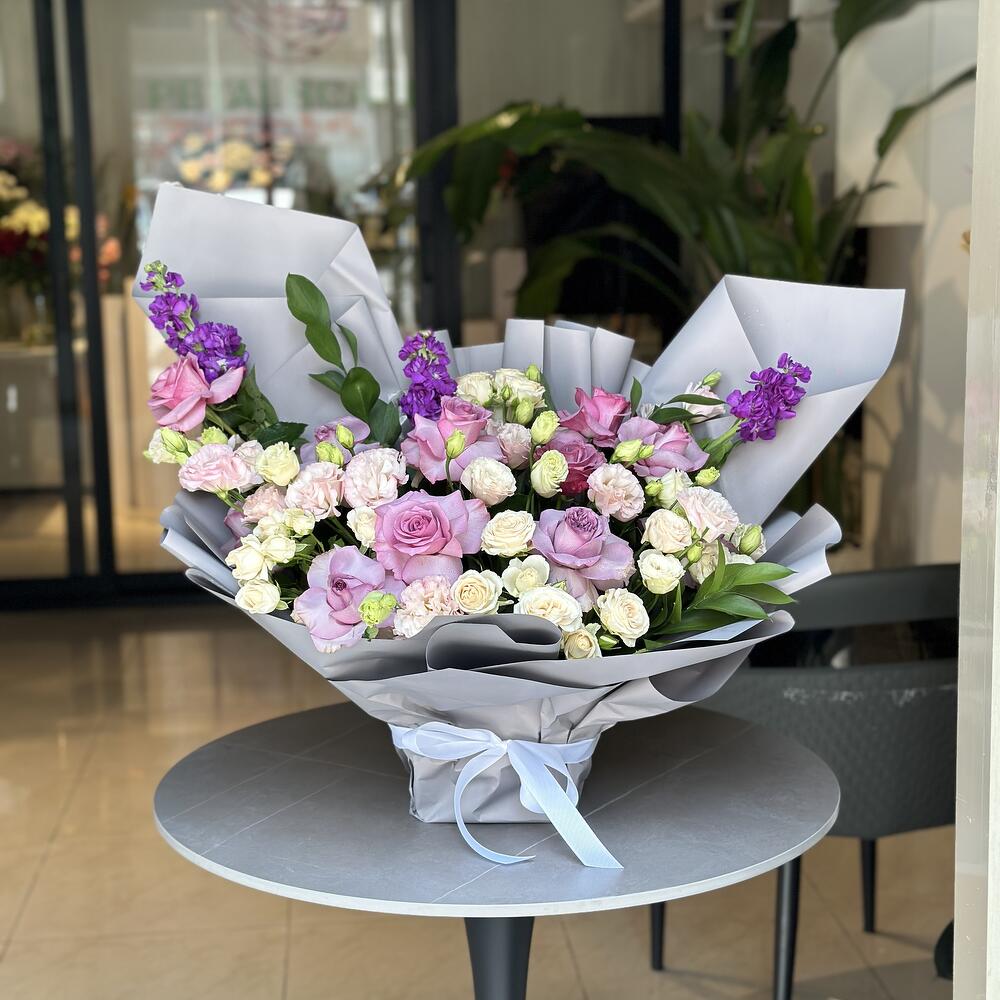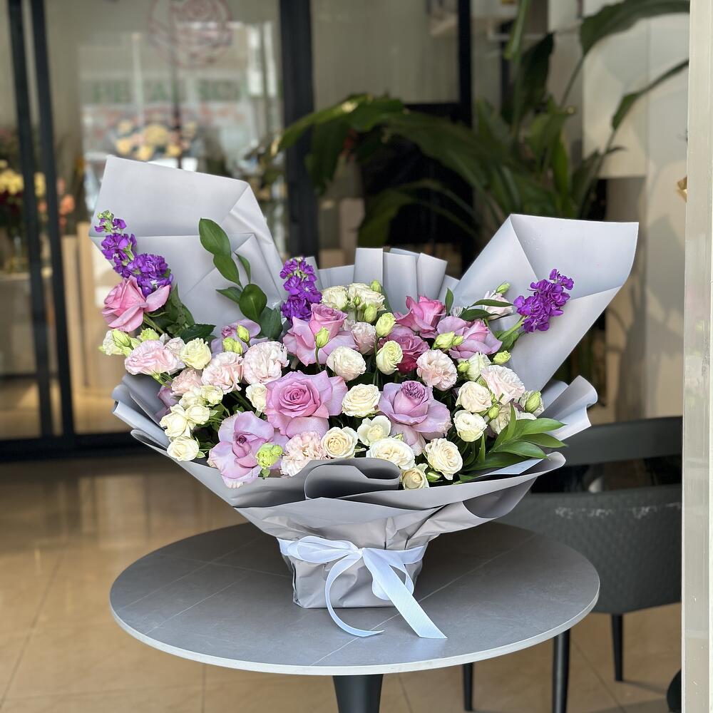 Sumérgete en el encantador atractivo de nuestro Especial del Florista, una mezcla armoniosa de 3 Mathiola moradas radiantes, 4 delicadas flores de Lisianthus color durazno, 3 atemporales Rosas Blancas, 5 encantadoras Rosas rosadas y 5 cautivadoras Rosas moradas. Este lujoso ramo, arreglado a mano, irradia elegancia y belleza, siendo el epítome del arte floral. Ya sea para una ocasión especial o sin motivo alguno, este arreglo excepcional encantará a cualquiera que lo contemple.