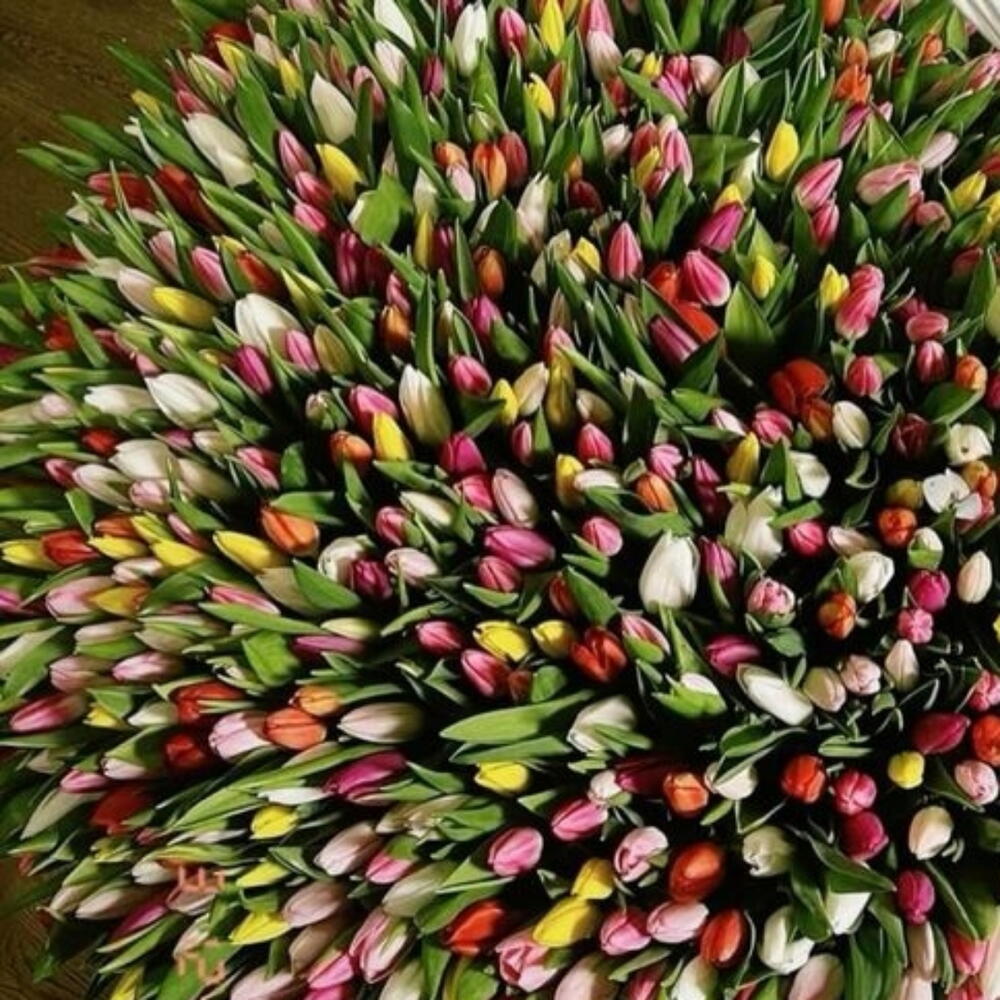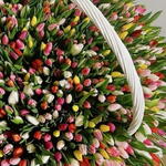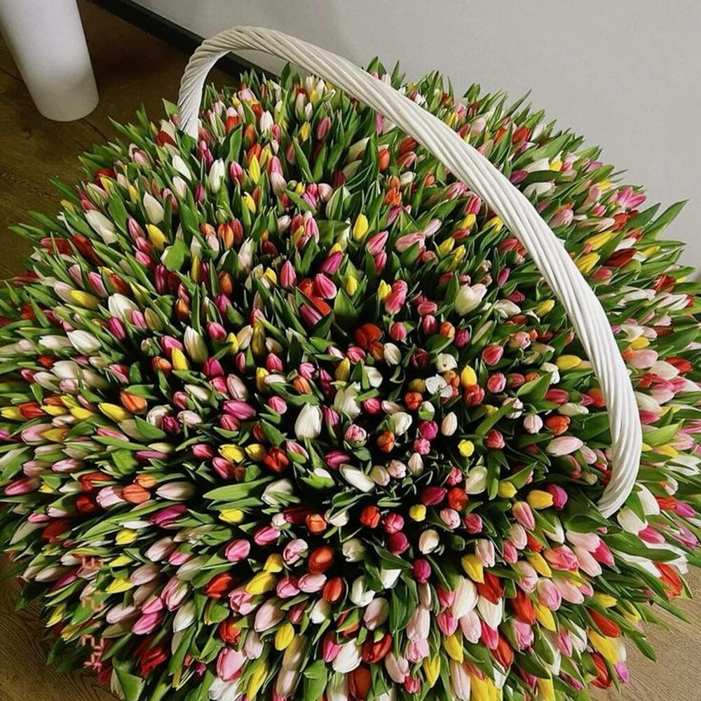 Basket - 1 ud. tulipanes naranjas - 150 ud. tulipanes rosas - 250 ud. tulipanes blancos - 250 ud. tulipanes morados - 150 ud. tulipanes rojos - 51 ud. tulipanes amarillos - 150 ud.
