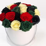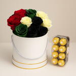 Red rose - 5 ud. Box - 1 ud. White rose - 5 ud. rosa negra pintada con spray - 5 ud. rosa verde rociada - 5 ud. ferrero rocher caja de chocolates (16piezas) - 1 ud.