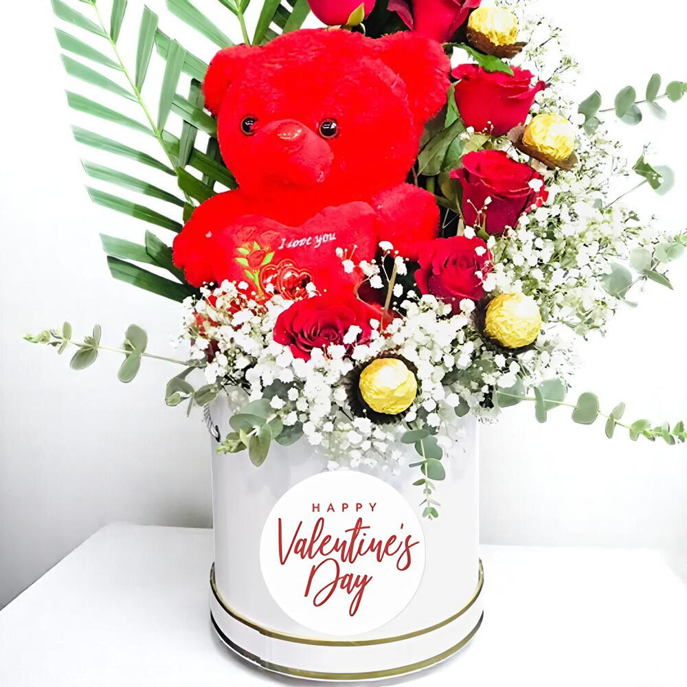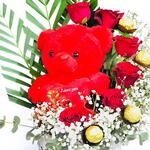 Sorprenda a su ser querido con el detalle más romántico: la Caja de Regalo Val-Combo para San Valentín. Este encantador arreglo incluye un osito de peluche rojo entre 7 rosas rojas aterciopeladas, exuberante follaje de eucalipto y delicado gypso, todo bellamente presentado en una caja premium con temática de San Valentín. Adornado con 5 exquisitos chocolates Ferrero Rocher, este regalo captura la esencia del amor, la dulzura y el cariño. Ya sea para San Valentín, un aniversario o una sorpresa romántica, esta caja es una forma encantadora de expresar su amor y hacer que esa persona se sienta verdaderamente querida. Instrucciones de cuidado: Mantenga el arreglo en un lugar fresco, alejado de la luz solar directa y del calor. Rocíe las rosas ligeramente a diario y compruebe la frescura del follaje. Los chocolates se consumen mejor en pocos días y se guardan en un lugar fresco y seco. Evite manipular el osito con frecuencia para conservar su textura afelpada.