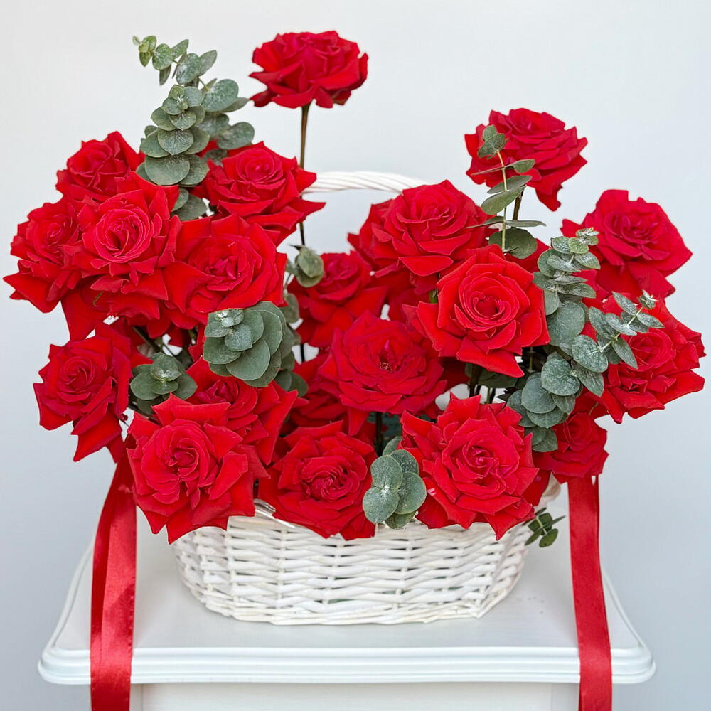 hermoso arreglo floral en una cesta de mimbre blanca. La cesta está llena de numerosas rosas rojas y vibrantes, acentuada con delicadas hojas verdes de eucalipto. Se han atado cintas rojas a las asas de la cesta, añadiendo un toque romántico. Este arreglo suele describirse como un símbolo clásico de amor profundo, pasión y emoción sincera, lo que lo convierte en una elección popular para aniversarios o el Día de San Valentín.