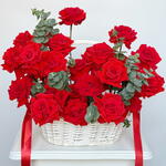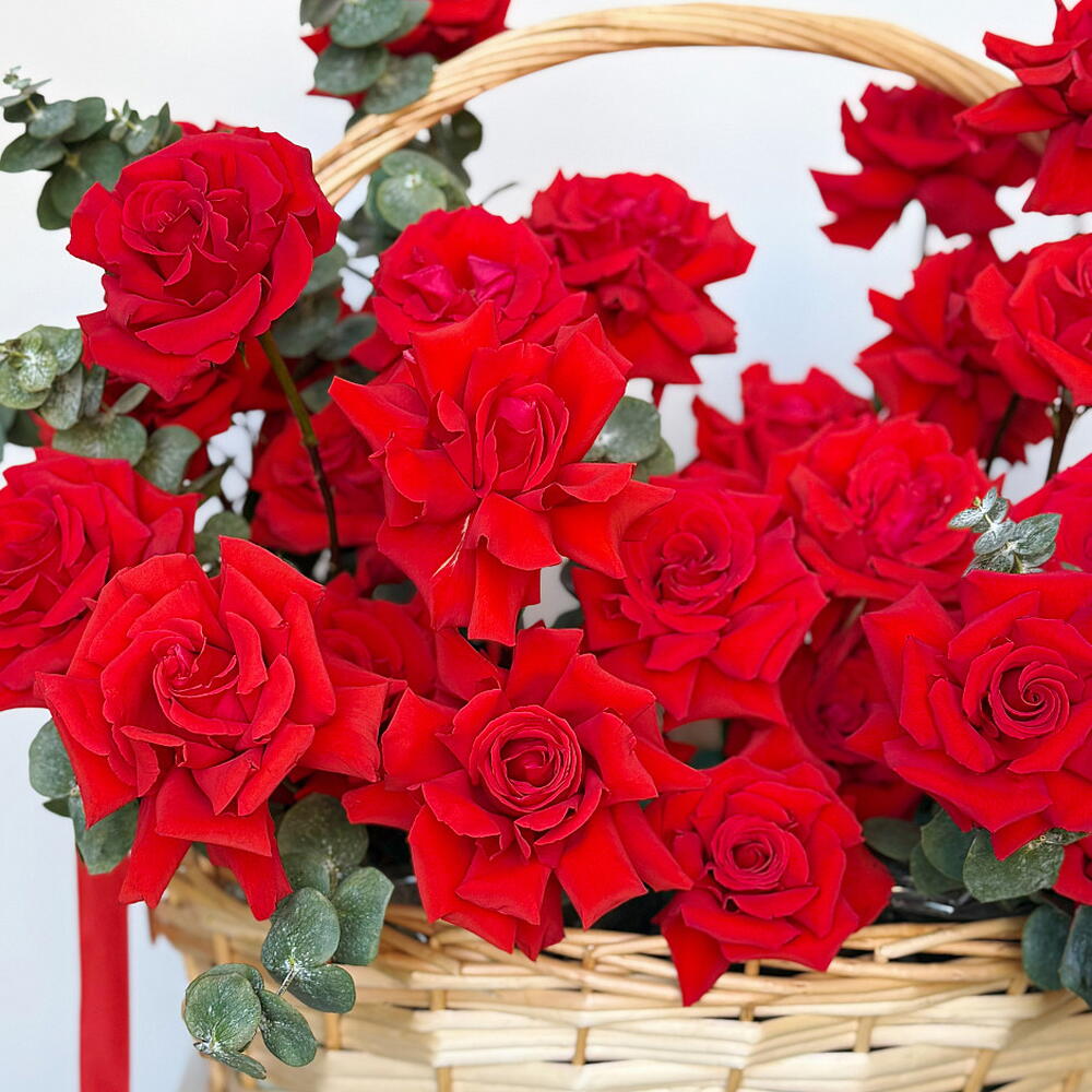 Eucalyptus - 10 ud. Basket - 1 ud. Red ribbon - 2 ud. rosas rojas clásicas - 45 ud.