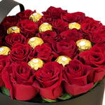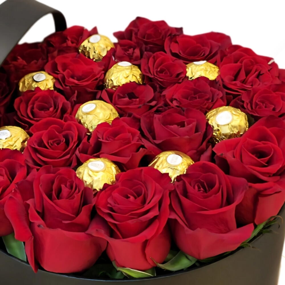 Una elegante caja negra con un ramo de lujosas rosas rojas adornado con bombones Ferrero Rocher. Perfecta para regalos premium y ocasiones especiales.