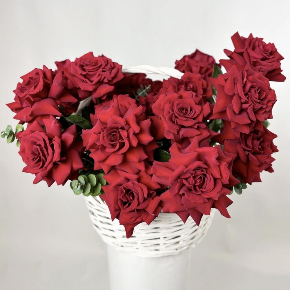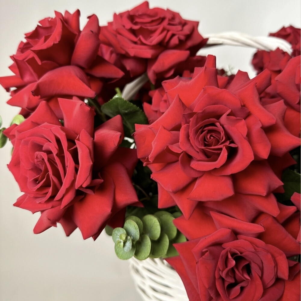 Eucalyptus - 7 ud. Basket - 1 ud. rosas rojas clásicas - 51 ud.