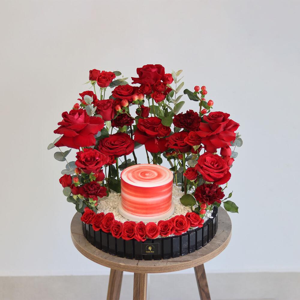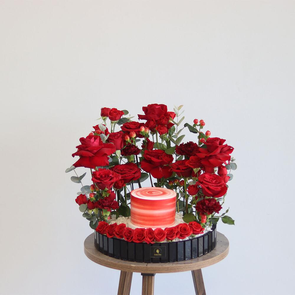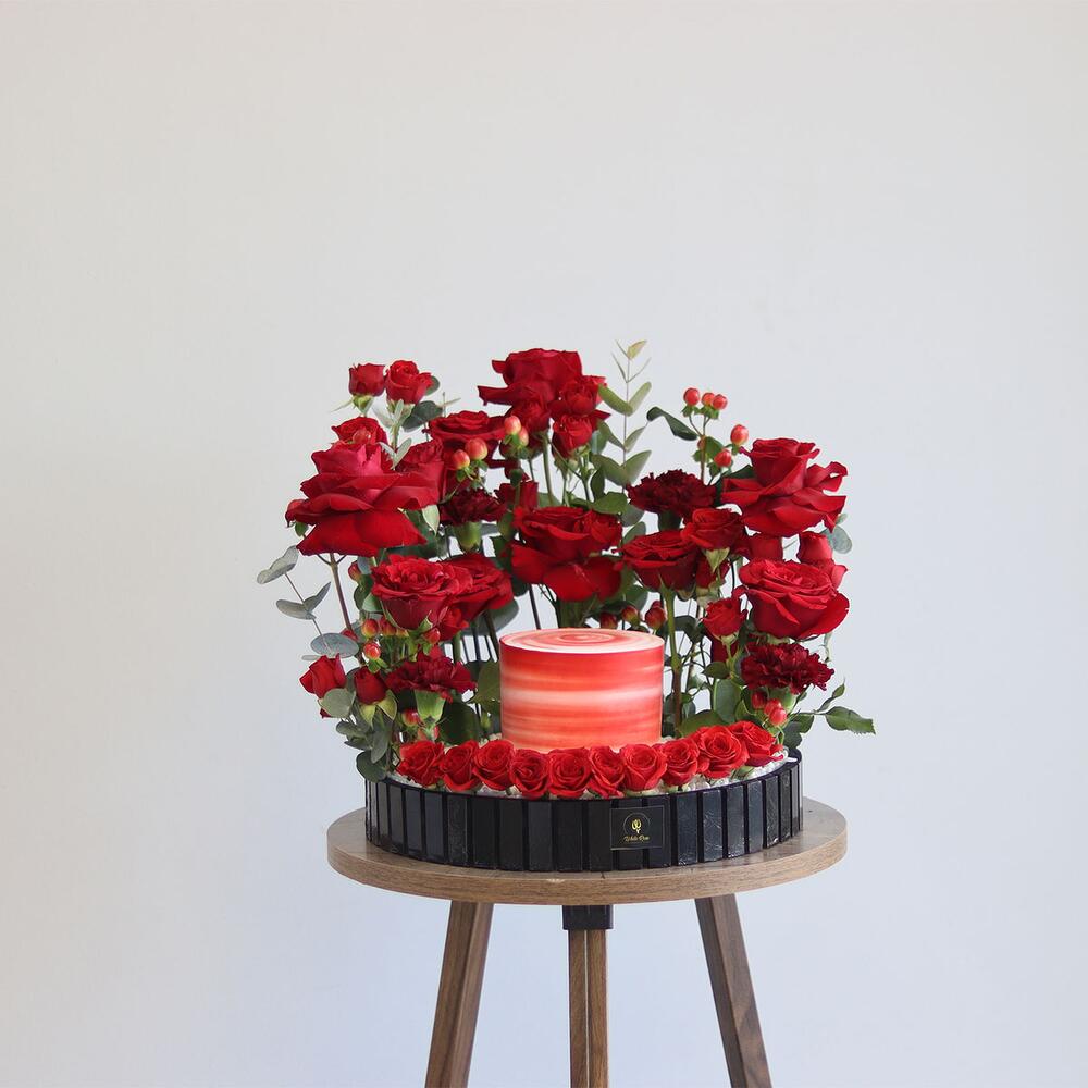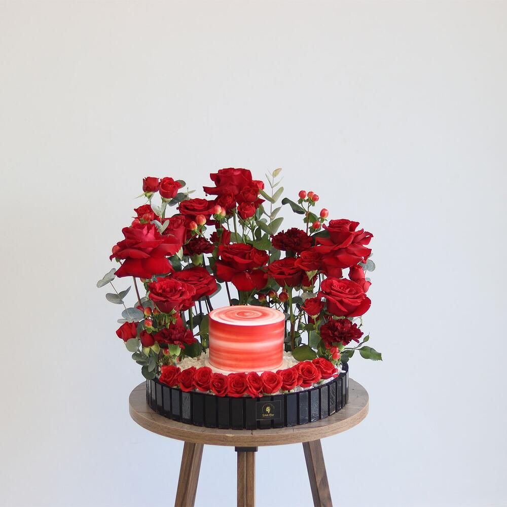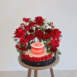 combinación de rosas, rosas pequeñas, claveles y otra mezcla de flores dispuestas con un pastel de 300 g en una bandeja