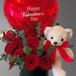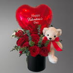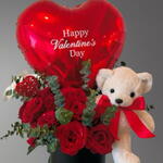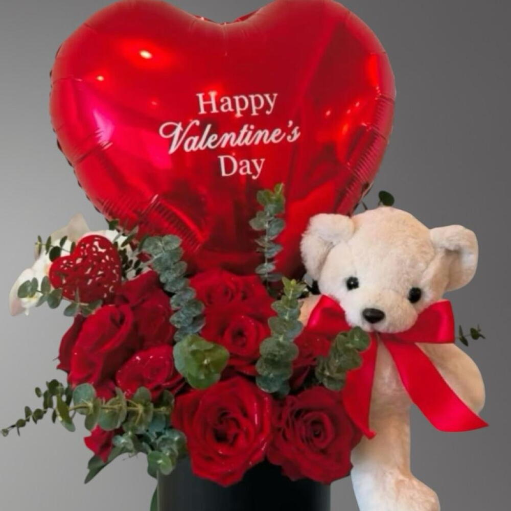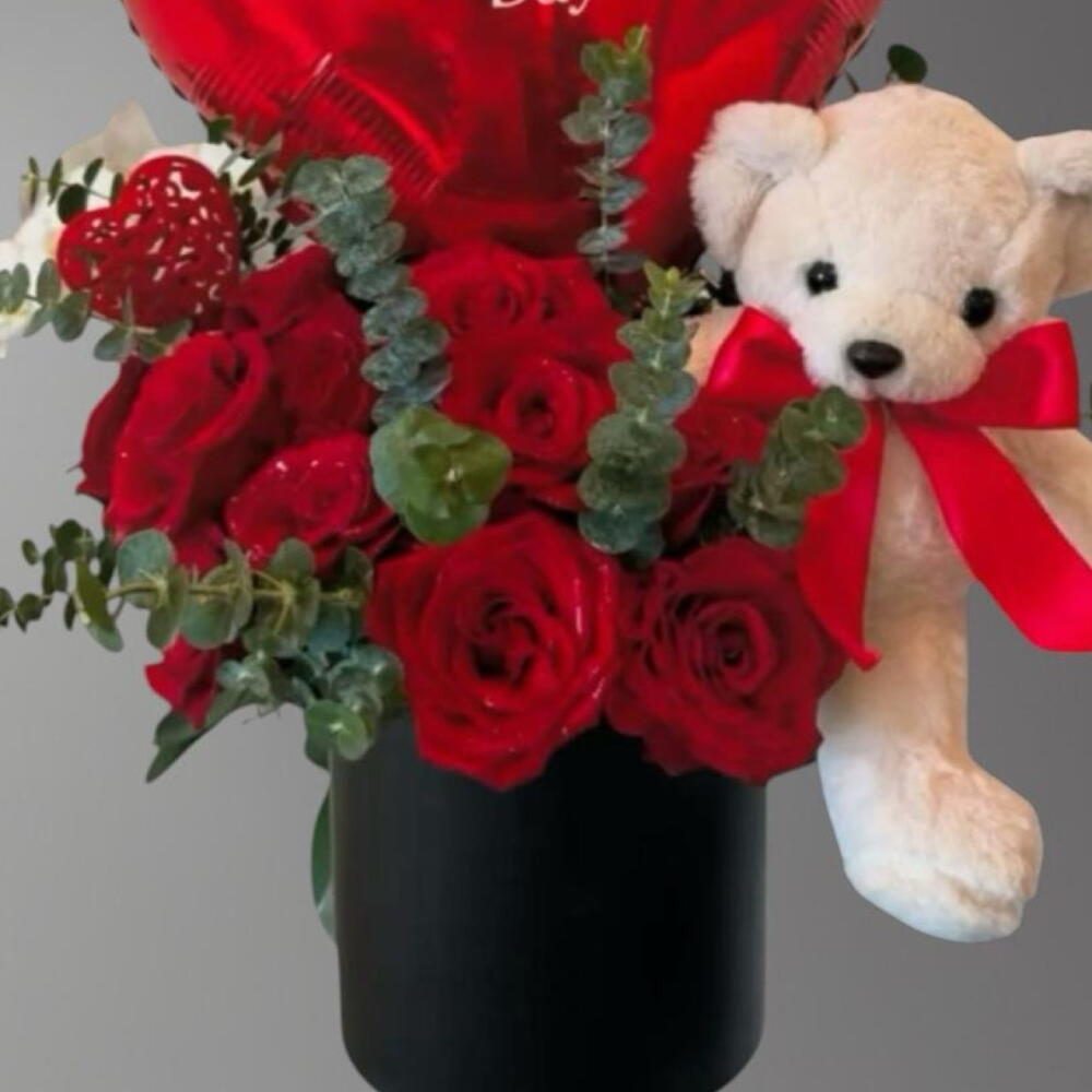 Red rose - 15 ud. Teddy bear - 1 ud. eucalyptus leaves - 6 ud. globo metálico te amo o feliz san valentín - 1 ud.
