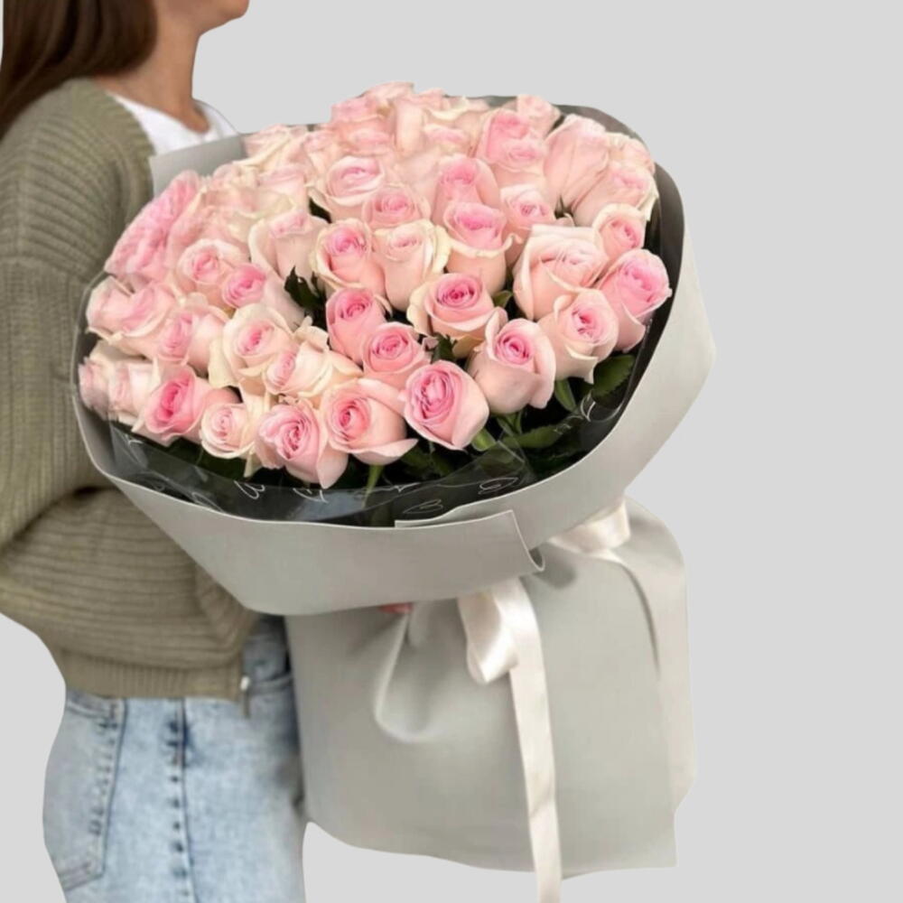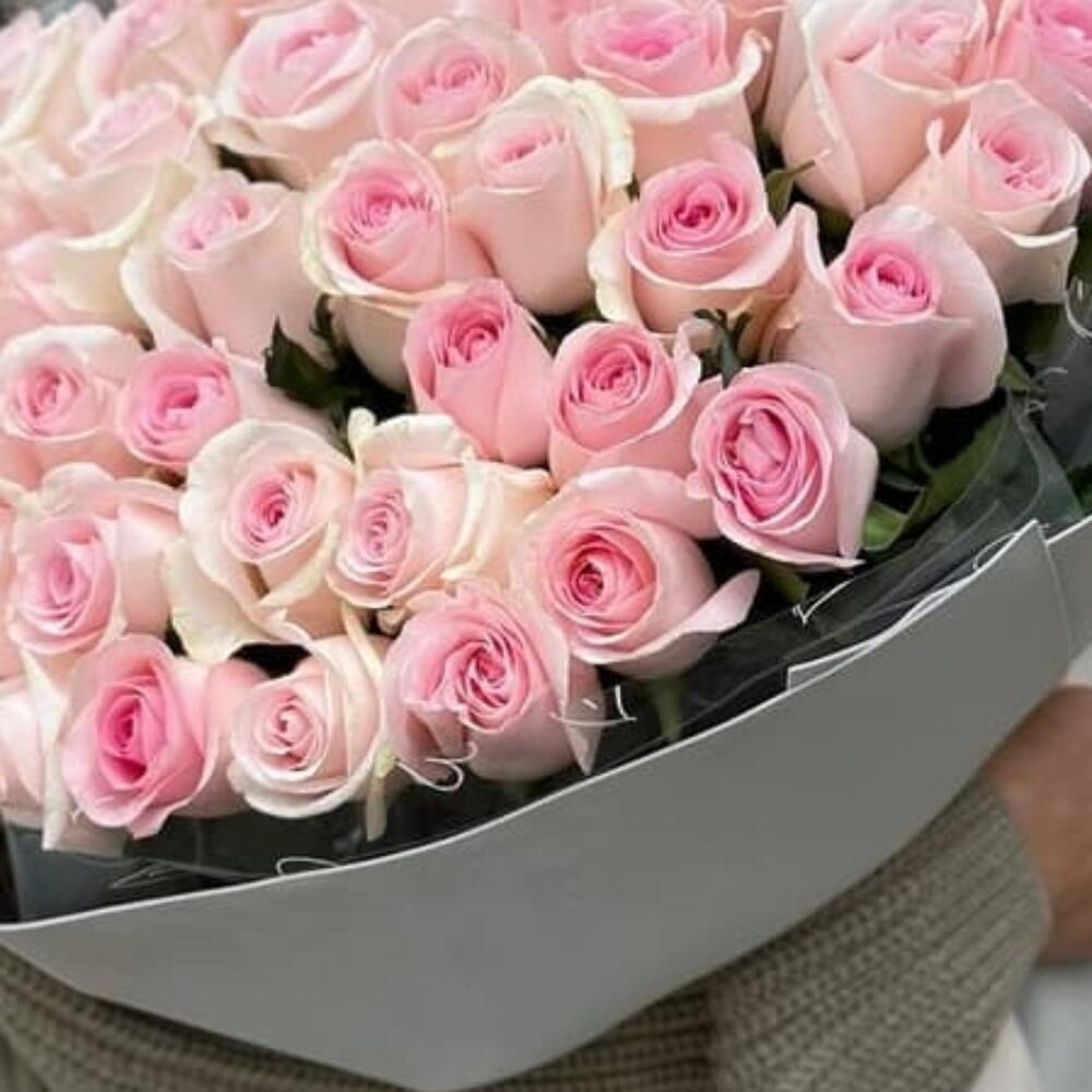 Disfruta del lujoso encanto de este impresionante ramo floral, compuesto por aproximadamente 51 rosas rosadas exquisitamente abiertas. Cada flor es seleccionada a mano por sus pétalos exuberantes, su color vibrante y su exquisita frescura.