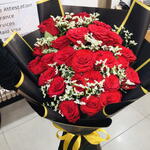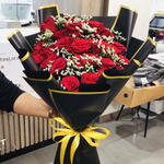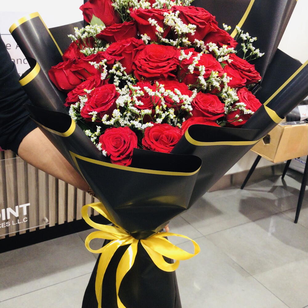 Red rose - 25 ud. limonium blanco - 5 ud. papel de regalo negro - 5 ud.