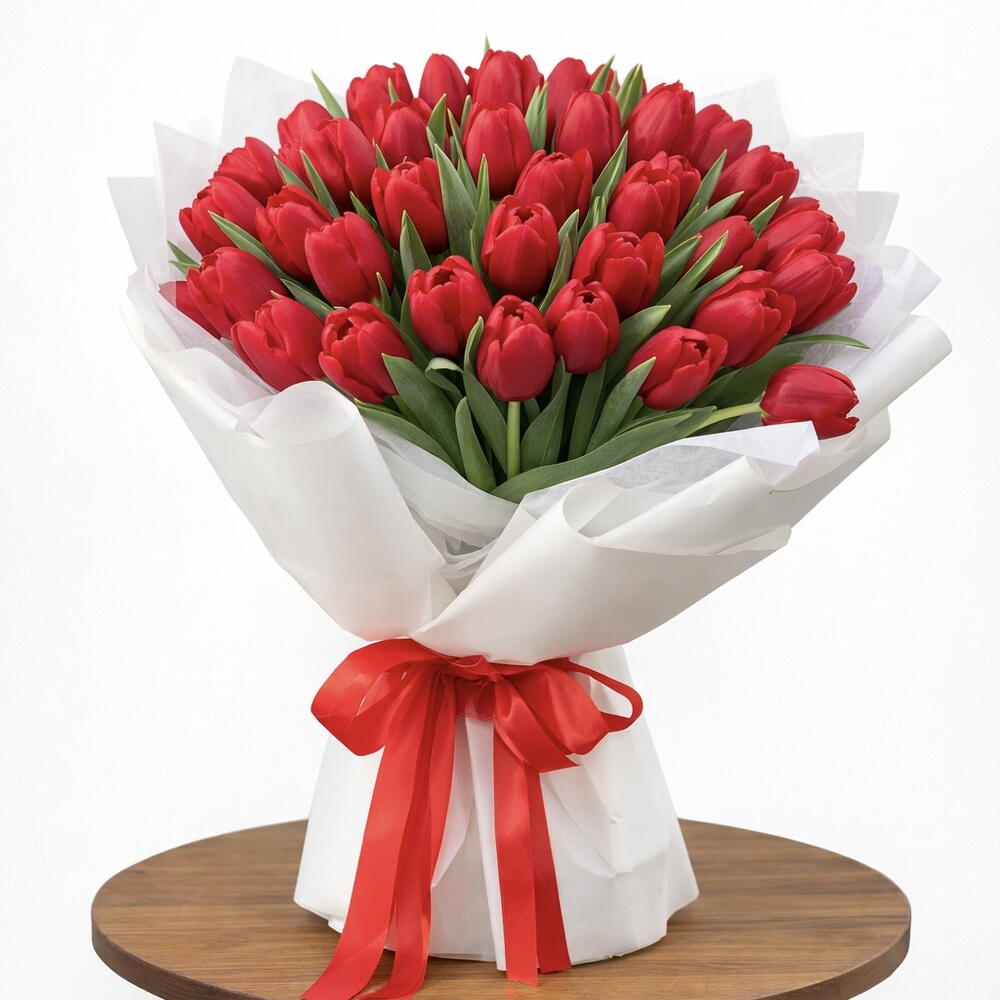 Ramo moderno de tulipanes rojos para el Día de la Mujer (45 tulipanes)