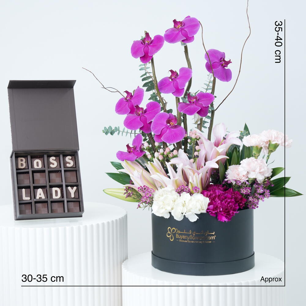 3 Pink Oriental Lilies 3 Pink Gerberas 1 Purple Phalaenopsis Orchid 1 Pink Hydrangea 2 Stems Eucalyptus 3 Stems Purple Wax Flower 5 Stems Ruscus Arranged In Medium Black Box Finished With Purple Ribbon Box Dimensions Diameter – 26 Cm Height – 15 Cm