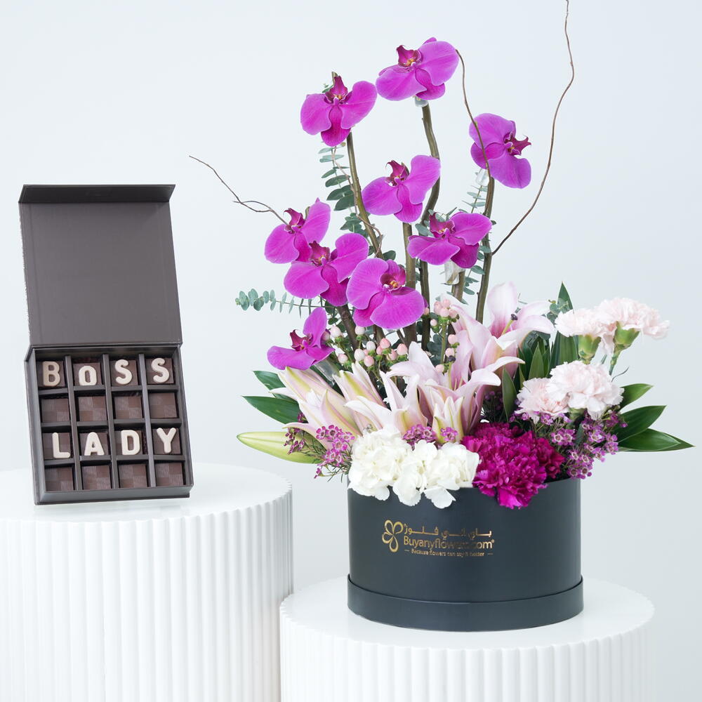 Caja de flores Valley con chocolate Boss Lady