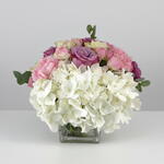 White rose - 4 ud. Vase - 1 ud. purple rose - 5 ud. clavel rosa - 5 ud. white hydrangea - 1 ud. spray rose pink - 4 ud. eucalyptus leaves - 1 ud.