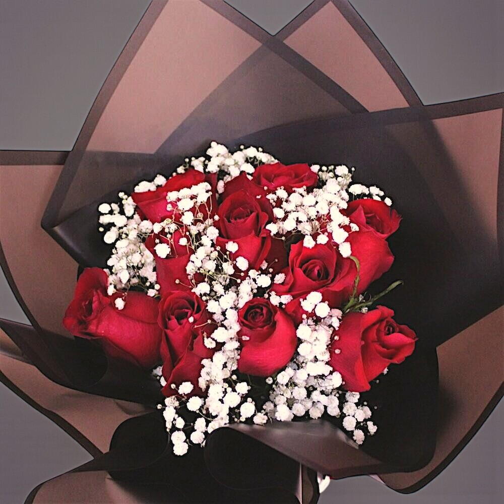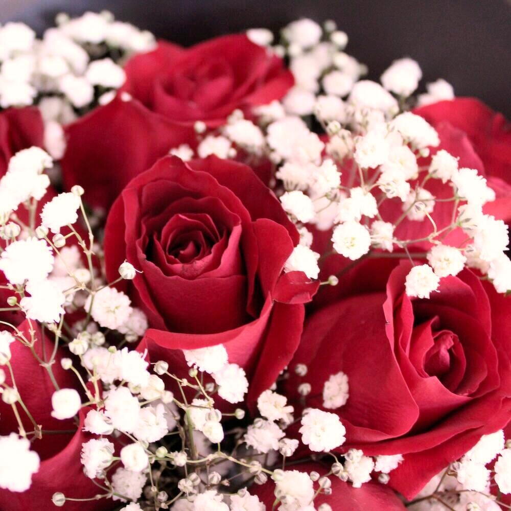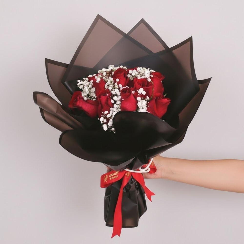 Este impresionante ramo exuda romanticismo y sofisticación, convirtiéndolo en el regalo perfecto para ocasiones especiales como aniversarios, cumpleaños o expresiones de amor profundo. Envuelto en un elegante papel translúcido negro con un lazo rojo, este ramo realza el contraste dramático entre las intensas rosas rojas y la delicada gypsophila, simbolizando la pasión y el amor eterno. Corte los tallos en ángulo antes de colocarlos en agua fresca. Cambie el agua cada dos días y mantenga las flores alejadas de la luz solar directa y el calor. Rocíe ligeramente los pétalos para mayor frescura.