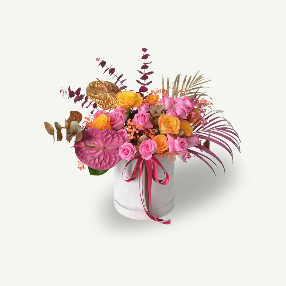 Una lujosa mezcla de 30 rosas naranjas y rosadas, 2 anturios dorados, 1 anturio rosa, hojas de areca doradas y rosadas, eucalipto rosado y dorado y gypsophila naranja, cuidadosamente elaborada en una caja de terciopelo blanco para un arreglo floral audaz y elegante.