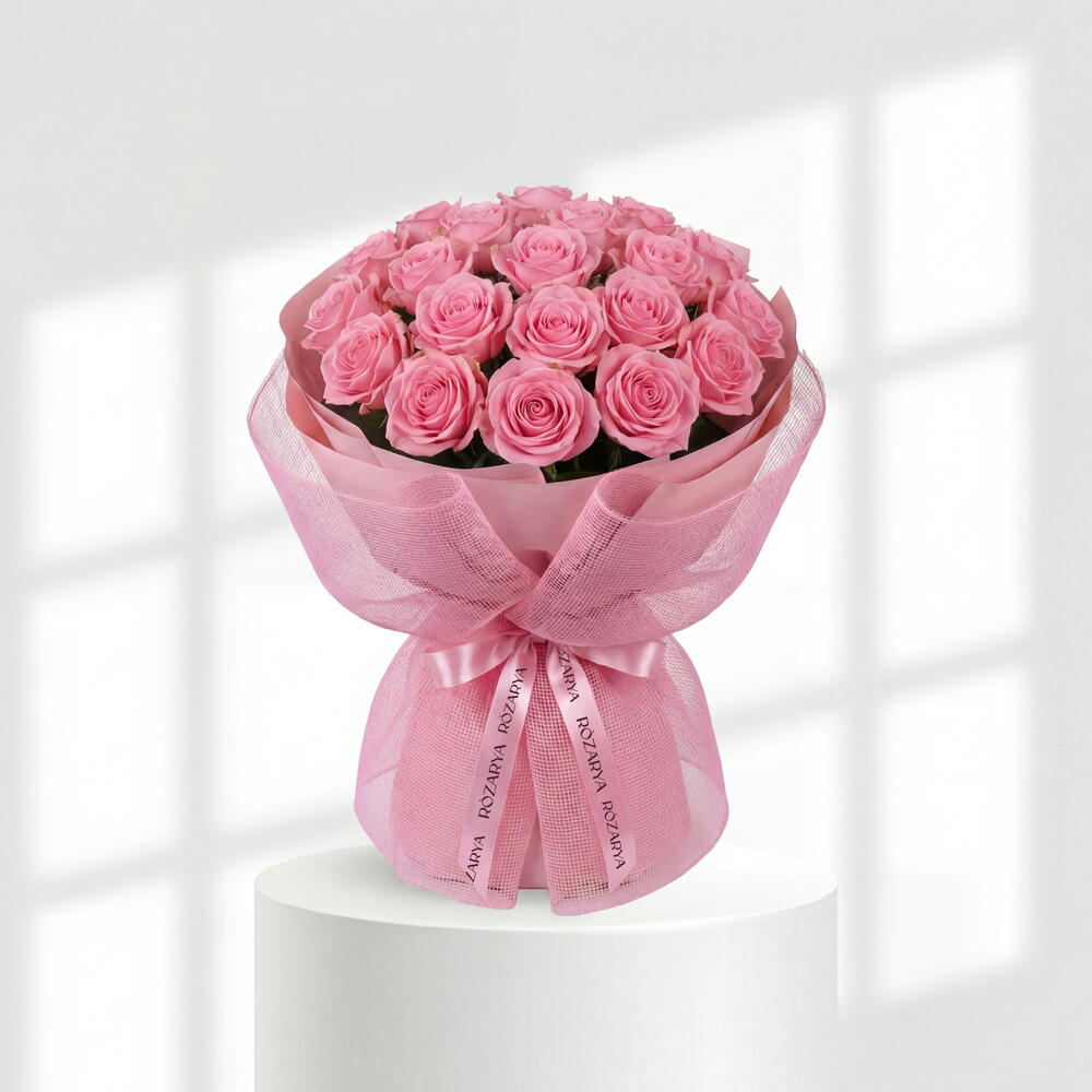 Un deslumbrante ramo de rosas rosadas premium, envuelto en papel mate rosa con acabado escarchado y malla delicada. Rematado con nuestra cinta exclusiva Rozarya para un toque de elegancia—perfecto para cualquier gesto romántico • Por favor, tenga en cuenta: Como las flores son productos naturales, los colores reales pueden variar ligeramente respecto a las imágenes digitales debido al crecimiento estacional y a las condiciones de iluminación. Garantizamos que se mantendrán siempre el estilo general, la calidad premium y la frescura de su arreglo.