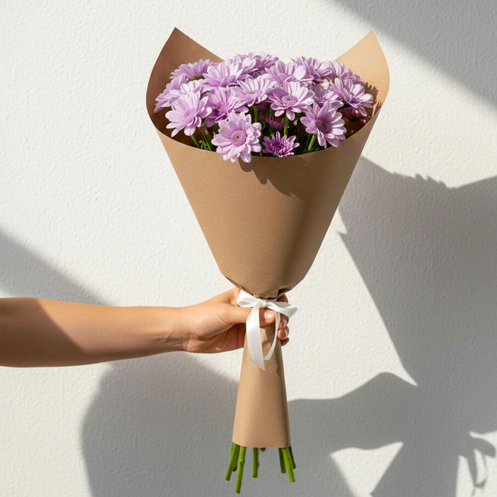 Ramillete compacto y encantador de 9 crisantemos morados, perfecto para regalar a diario. El suave tono violeta aporta elegancia y frescura—ideal para sorpresas informales, regalos de agradecimiento o decoración.