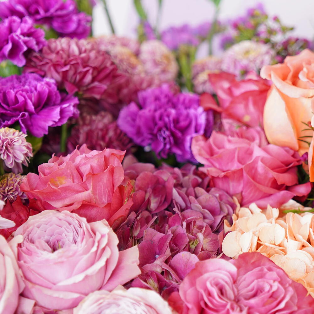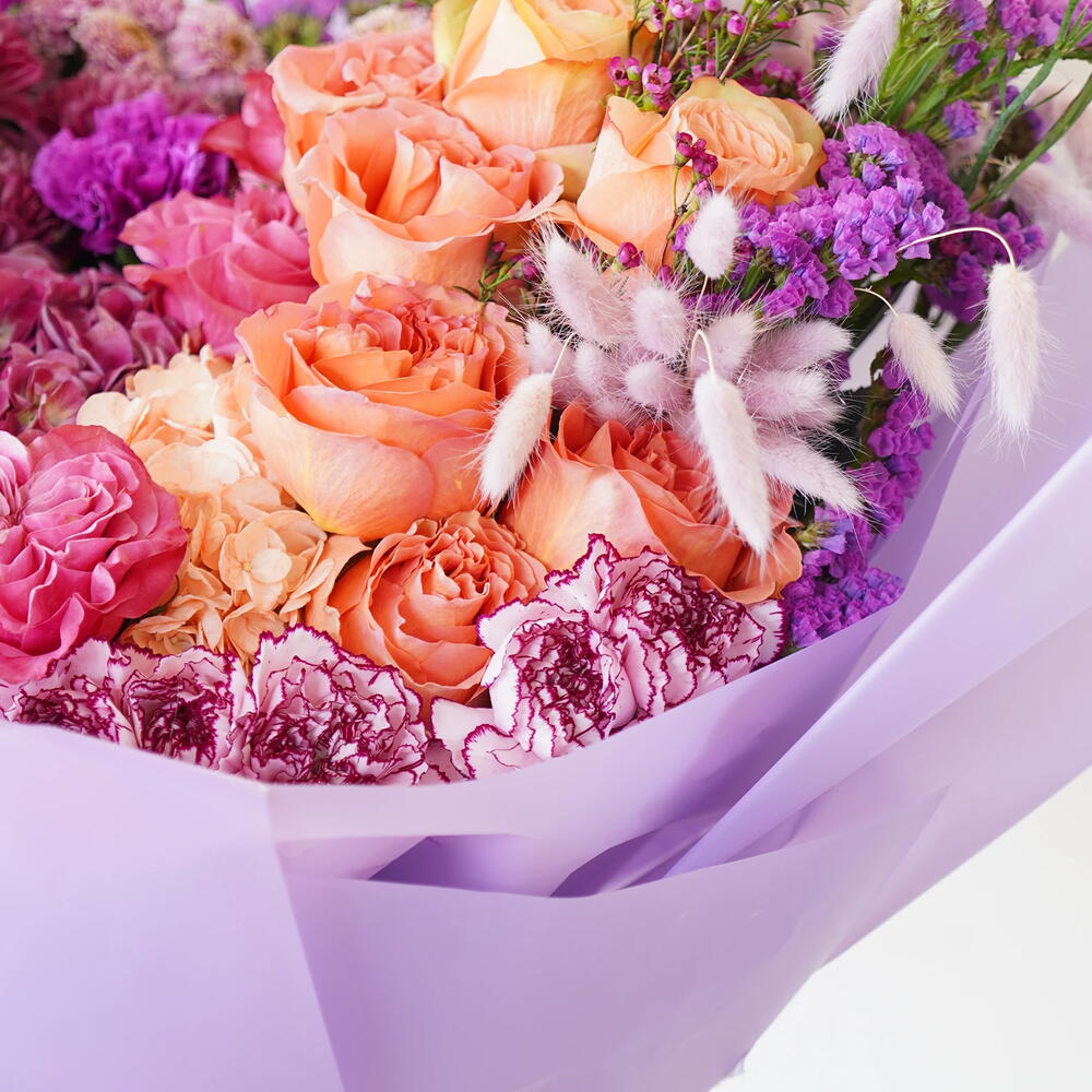 carnation - 10 ud. statice púrpura - 5 ud. rosas mixtas - 15 ud. crisantemo - 5 ud.