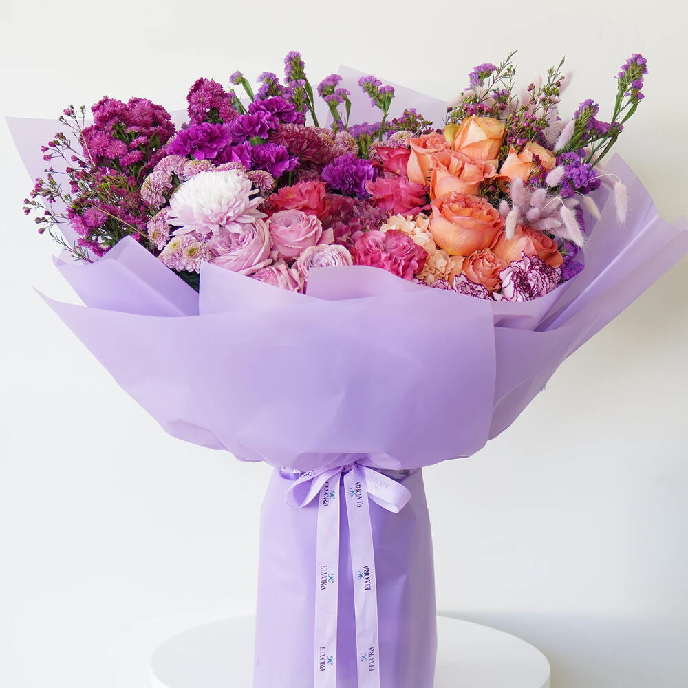 Violet Luxe Statement is a bold luxury flower arrangement designed for expressive interiors. Featuring premium purple flowers wrapped with modern detailing, this tall arrangement reflects creativity, individuality, and high-end floral artistry. Keywords: purple flowers, luxury bouquet, statement floral arrangement, premium bloom.