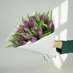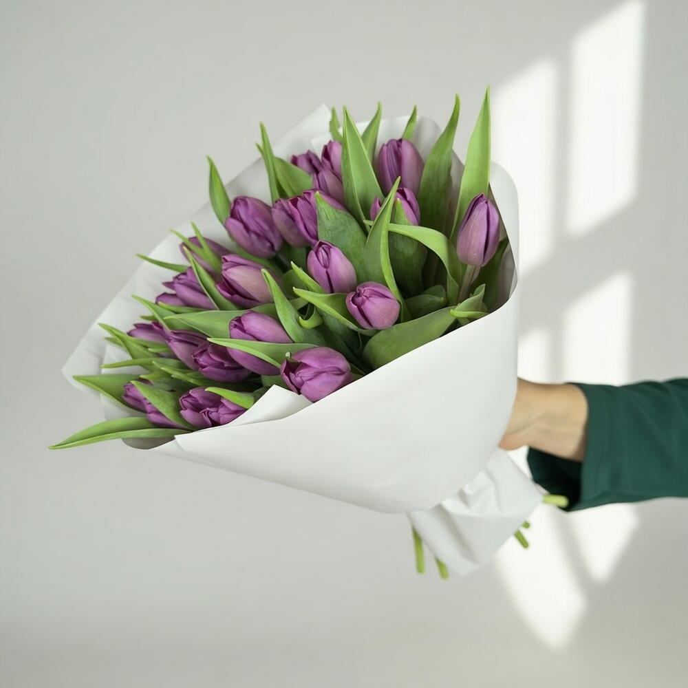 Royal Bloom es un llamativo monoramo compuesto por veinticinco tulipanes morados intensos, dispuestos de forma limpia y equilibrada. Su intenso tono violeta simboliza admiración, inspiración y sincero agradecimiento, lo que lo convierte en un ramo expresivo y alentador. Las flores se envuelven cuidadosamente en un embalaje de primera calidad y se rematan con una cinta de satén, creando una presentación refinada, ideal tanto para ocasiones personales como formales. Los tallos alargados y la silueta amplia le otorgan al ramo una presencia elegante y delicada. Este arreglo es ideal para el Día Internacional de la Mujer, aniversarios, graduaciones, compromisos, la bienvenida de un recién nacido o como una sorpresa especial sin una ocasión específica. Es una hermosa opción para una madre, pareja, amiga, maestra, coach o colega respetada. Fresco, vibrante y lleno de energía positiva: un ramo diseñado para alegrar el día de cualquier persona al instante.