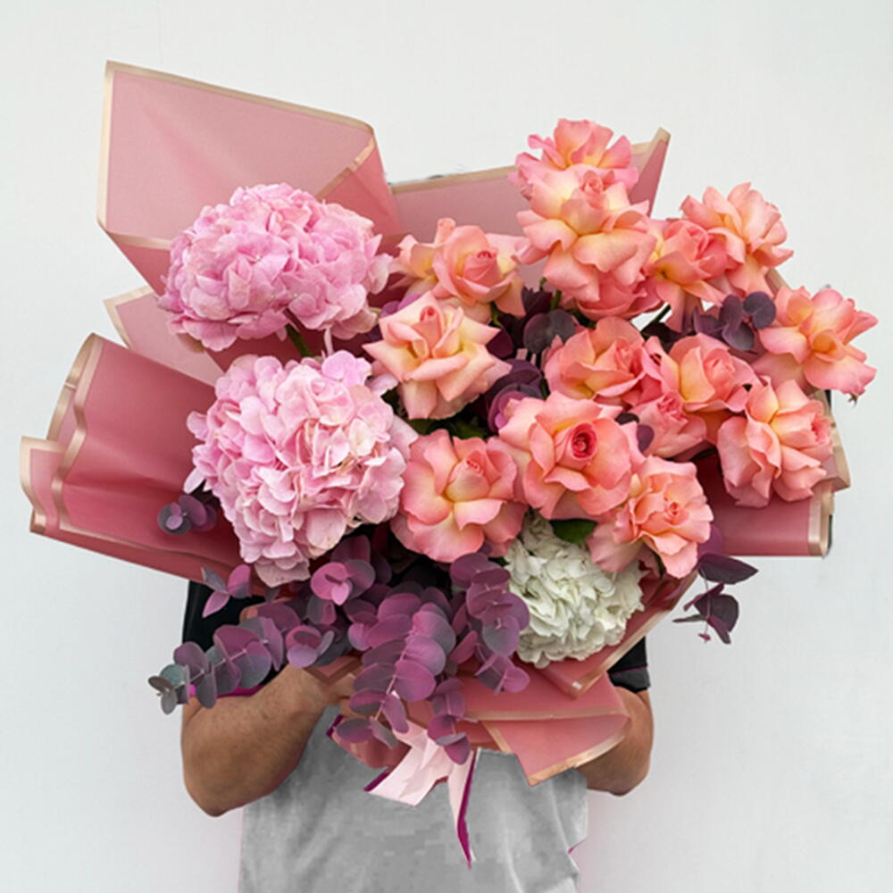 Este audaz y hermoso ramo en colores pastel está hecho para momentos “WOW”—grande, lujoso y lleno de cálidos tonos melocotón con suaves acentos en rosa. Es un ramo premium de flores mixtas / ramo de flor mixta que presenta elegantes rosas melocotón (un deslumbrante ramo de rosas / ramo Rosses) combinadas con esponjosas peonías rosas (peonías / Peonia), una base de suaves hortensias blancas y eucalipto fresco para un acabado moderno y aireado (la variedad de flores puede variar ligeramente según la temporada, pero se mantiene el mismo aspecto y sensación). Envuelto en un elegante papel rosa con acabado premium, este es un ramo de flores frescas (ramo fresco) hecho con calidad premium y flores de calidad premium—a un verdadero ramo de flores premium que se ve increíble en fotos y aún mejor en la vida real. Perfecto como ramo de cumpleaños y definitivamente candidato a ser el mejor ramo de cumpleaños—ideal para flores de cumpleaños, flores para cumpleaños y regalos de cumpleaños inolvidables. También funciona maravillosamente como un ramo romántico lleno de amor y flores románticas, y es una de las mejores flores para aniversarios cuando quieres algo grandioso. Un ramo elegante y moderno que se siente como un ramo de tendencia y un ramo de flores realmente único—perfecto para clientes que buscan el mejor ramo en Dubái.