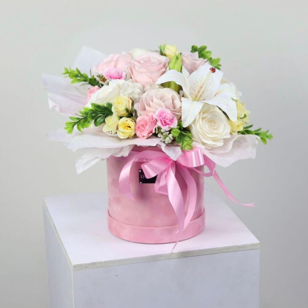 Un arreglo especial del florista verdaderamente excepcional que captura la esencia de la gracia y la belleza femeninas. Consta de cuatro tiernas rosas rosadas, tres delicadas rosas pequeñas y tres sublimes flores de lirio anidadas entre el follaje verde, todo bellamente dispuesto en una elegante caja rosa. Este exquisito ramo está graciosamente atado con una encantadora cinta rosa, ofreciendo un paquete completo de encanto y elegancia ideal para cualquier ocasión.