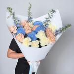 White rose - 9 ud. rosa capuchino - 8 ud. delphinium azul - 4 ud. crisantemo peonía azul - 5 ud.