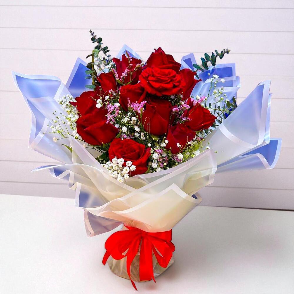 El Ramo de Rosas Susurrantes es un arreglo floral atemporal, creado para expresar profundo amor, admiración y elegancia. Con 15 impresionantes rosas rojas, este ramo irradia pasión y romance, lo que lo convierte en el regalo ideal para aniversarios, San Valentín o celebraciones especiales. Para realzar la belleza natural de las rosas, está delicadamente decorado con 3 ramitas de gypsophila blanca y 3 tallos frescos de eucalipto, que aportan suavidad, equilibrio y frescura al diseño. Envuelto en papel pastel de primera calidad con una atrevida cinta de satén, este ramo simboliza la sofisticación y el cariño eterno. El Ramo de Rosas Susurrantes combina el romance clásico con un toque de encanto moderno. Las rosas de color carmesí intenso crean un contraste impactante con la delicada gypsophila, mientras que las hojas de eucalipto aportan elegancia y un aroma fresco. Este ramo es perfecto para gestos románticos, aniversarios o como una lujosa sorpresa para alegrar el día. Su belleza y equilibrio lo hacen ideal para cualquier ocasión especial. Instrucciones de cuidado: Para preservar la frescura de su ramo, coloque las flores en un jarrón limpio con agua fresca inmediatamente después de recibirlas. Recorte los tallos diagonalmente cada dos días y renueve el agua regularmente para asegurar su hidratación. Mantenga el ramo alejado de la luz solar directa, fuentes de calor y frutos en maduración para prolongar la vida de las rosas. Con el cuidado adecuado, las flores se mantendrán vibrantes y encantadoras durante varios días.