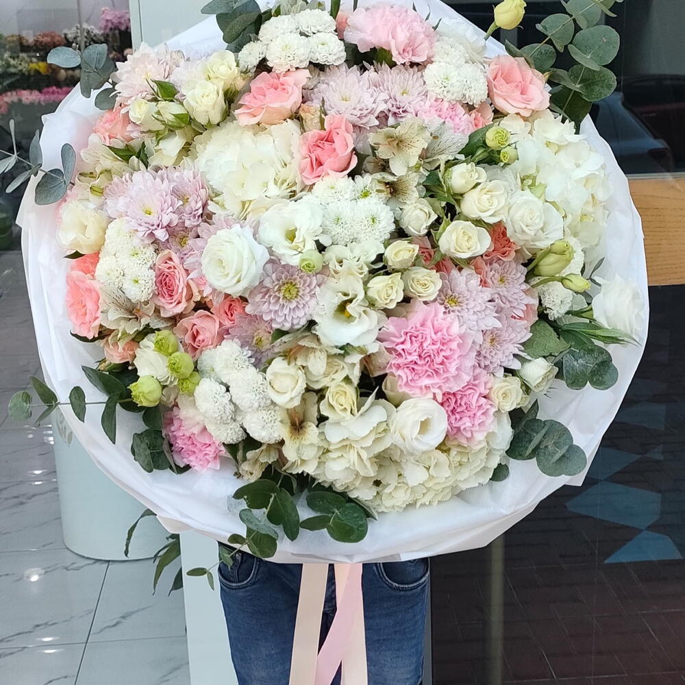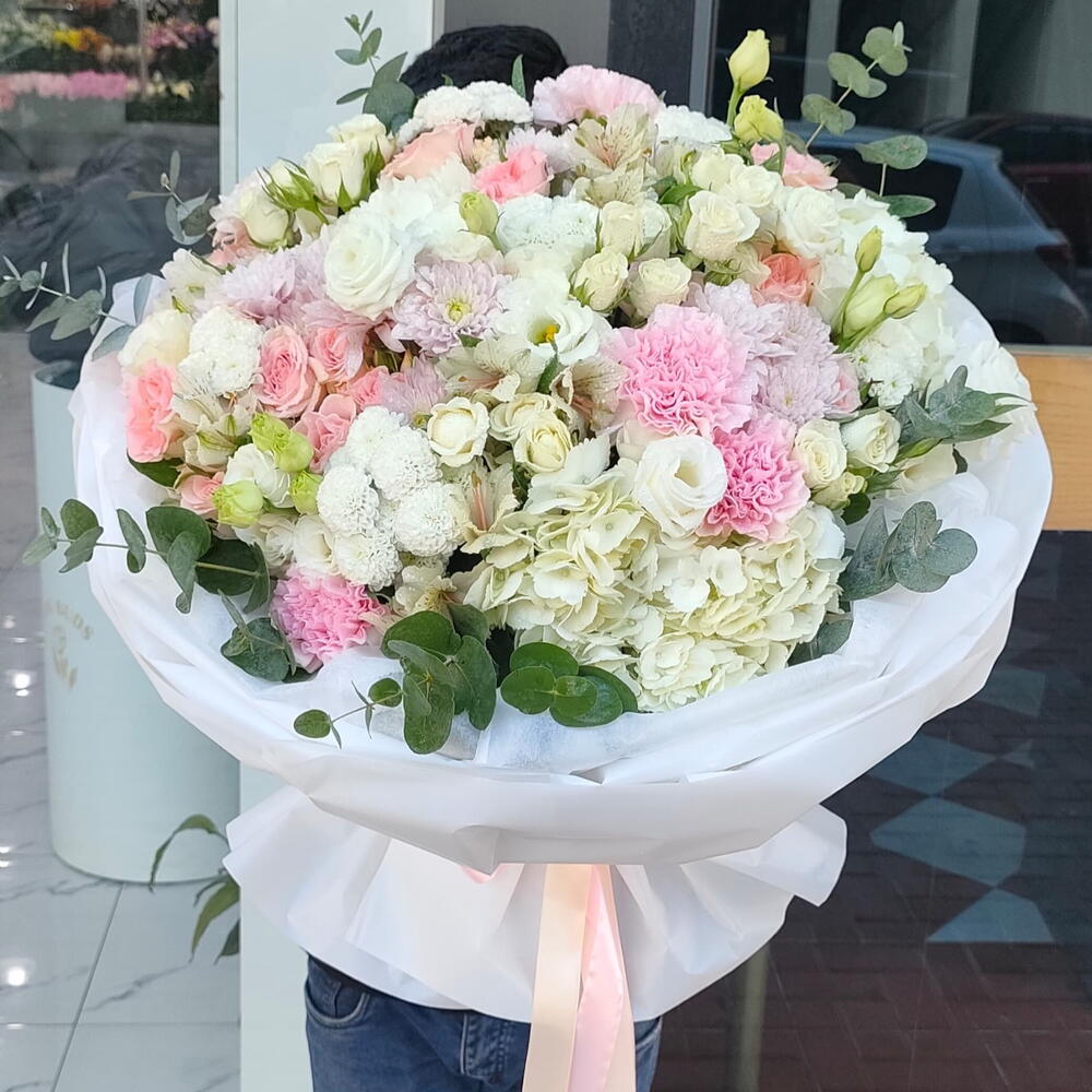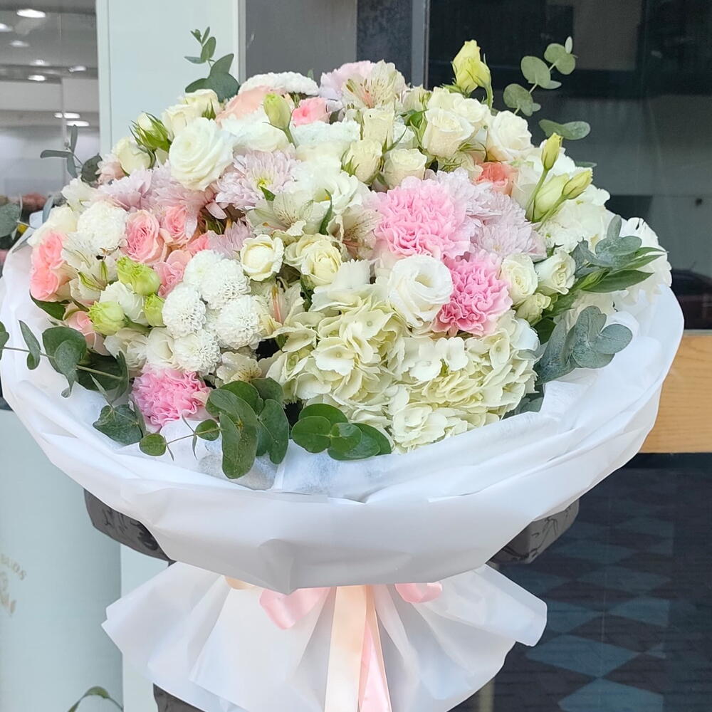 Eucalyptus - 5 ud. tallos de claveles rosas - 5 ud. crisantemo blanco - 4 ud. rosa blanca en aerosol - 5 ud. white hydrangea - 3 ud. sweet sara spray rose - 5 ud. alstroemeria - 6 ud. crisantemos blancos tipo botón - 4 ud.