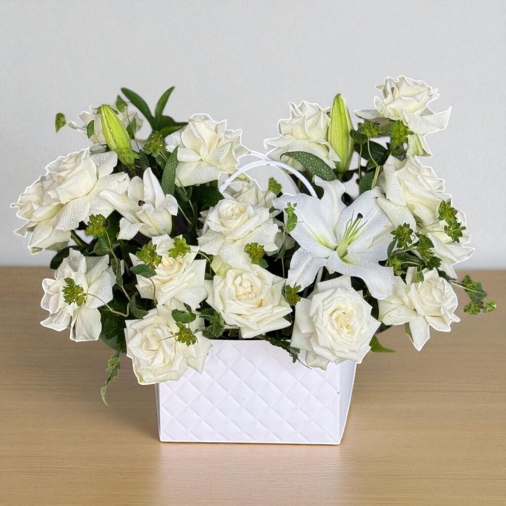 Flores Blancas en una bolsa;15 tallos de rosa blanca y 2 tallos lirios blancos en una bolsa blanca
