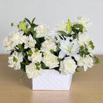 Experimente la belleza atemporal de la pureza y la elegancia con este impresionante arreglo floral completamente blanco. Con impecables rosas blancas y delicados lirios, en una elegante caja acolchada, este ramo irradia sofisticación y gracia. Cada flor está bañada por gotas de rocío, dándole un aspecto de recién cortada que realza su encanto natural. Los toques de vegetación fresca añaden un contraste suave y vibrante, haciéndolo perfecto para cualquier ocasión serena o emotiva. Ya sea para celebrar el amor, expresar condolencias o simplemente dar las gracias, este ramo transmite sus sentimientos con sutileza y refinamiento. Un regalo elegante que aporta paz, belleza y calidez a cualquier ambiente.