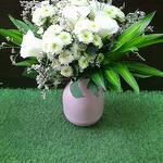 La imagen muestra un vibrante ramo de flores blancas, probablemente con rosas blancas y posiblemente crisantemos o velo de novia (Gypsophila), dispuesto en un jarrón acanalado de color rosa claro. El frondoso follaje verde, posiblemente hojas de drácena, complementa las flores blancas y añade un contraste llamativo.