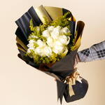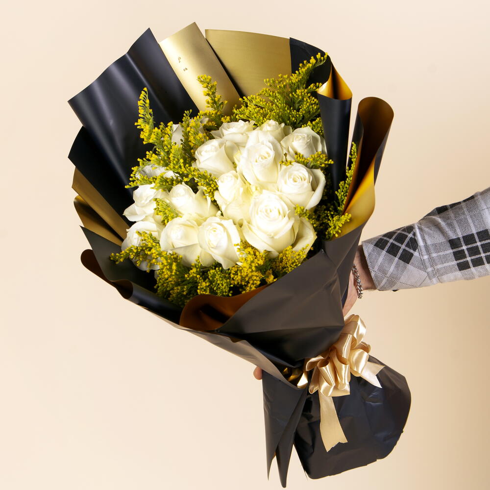 Un encantador ramo redondo de rosas de un blanco puro, acentuado con solidago amarillo brillante, que combina elegancia y alegría en un diseño suave y atemporal.