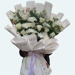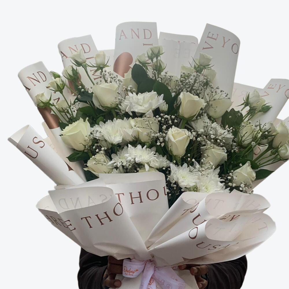 baby breath - 2 ud. crisantemo blanco - 5 ud. rosa blanca en aerosol - 4 ud. rosas blancas - 10 ud.