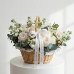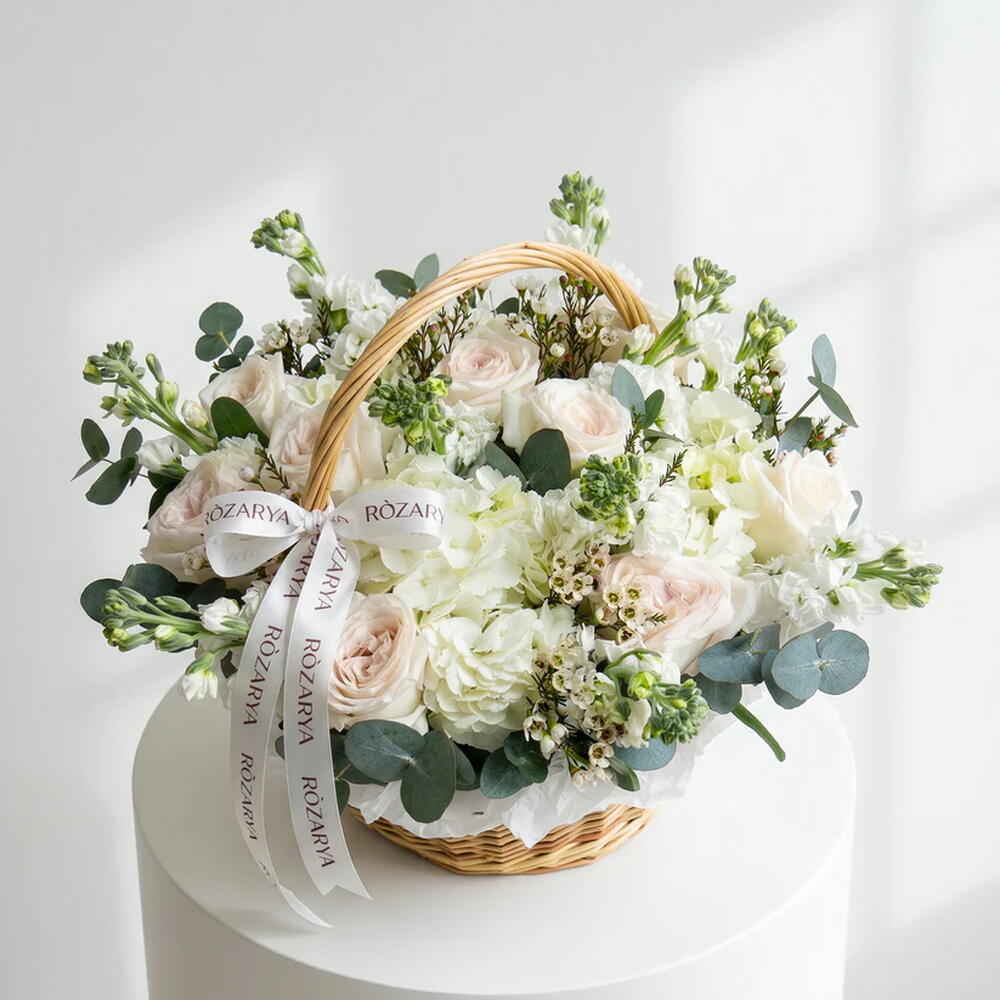 An elegant basket arrangement in soft white shades with roses, hydrangea, matthiola, wax flower, and eucalyptus. Fresh, airy, and refined, this composition is perfect for birthdays, Mother’s Day, women’s celebrations, and heartfelt gifting. • Please Note: As flowers are natural products, actual colors may vary slightly from digital images due to seasonal growth and lighting conditions. We guarantee that the overall style and premium quality as well as freshness of your arrangement will always be maintained.