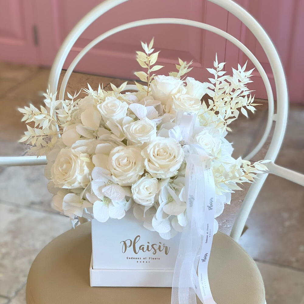 Un lujo absoluto, esta hermosa caja de terciopelo contiene una mezcla de Infinity, también conocida como Preserved Rose o Forever Rose, y flores secas y de seda que no mueren y mantienen su forma y belleza. La persona que la reciba podrá disfrutar de esta delicada belleza durante mucho tiempo y se acordará de ti todos los días del año!